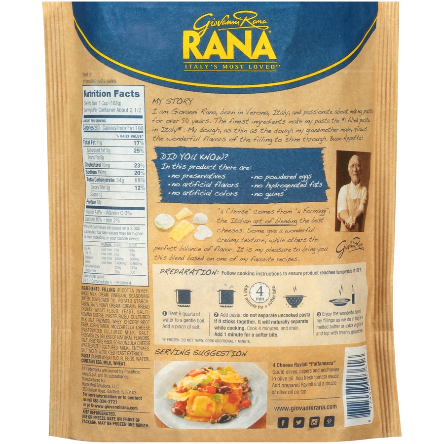4 Cheese Ravioli. Deliciously creamy ricotta, parmesan, provolone, and mozzarella cheese wrapped in thin dough. Packed with 14 grams of protein per serving. Made with no artificial flavors, no artific…