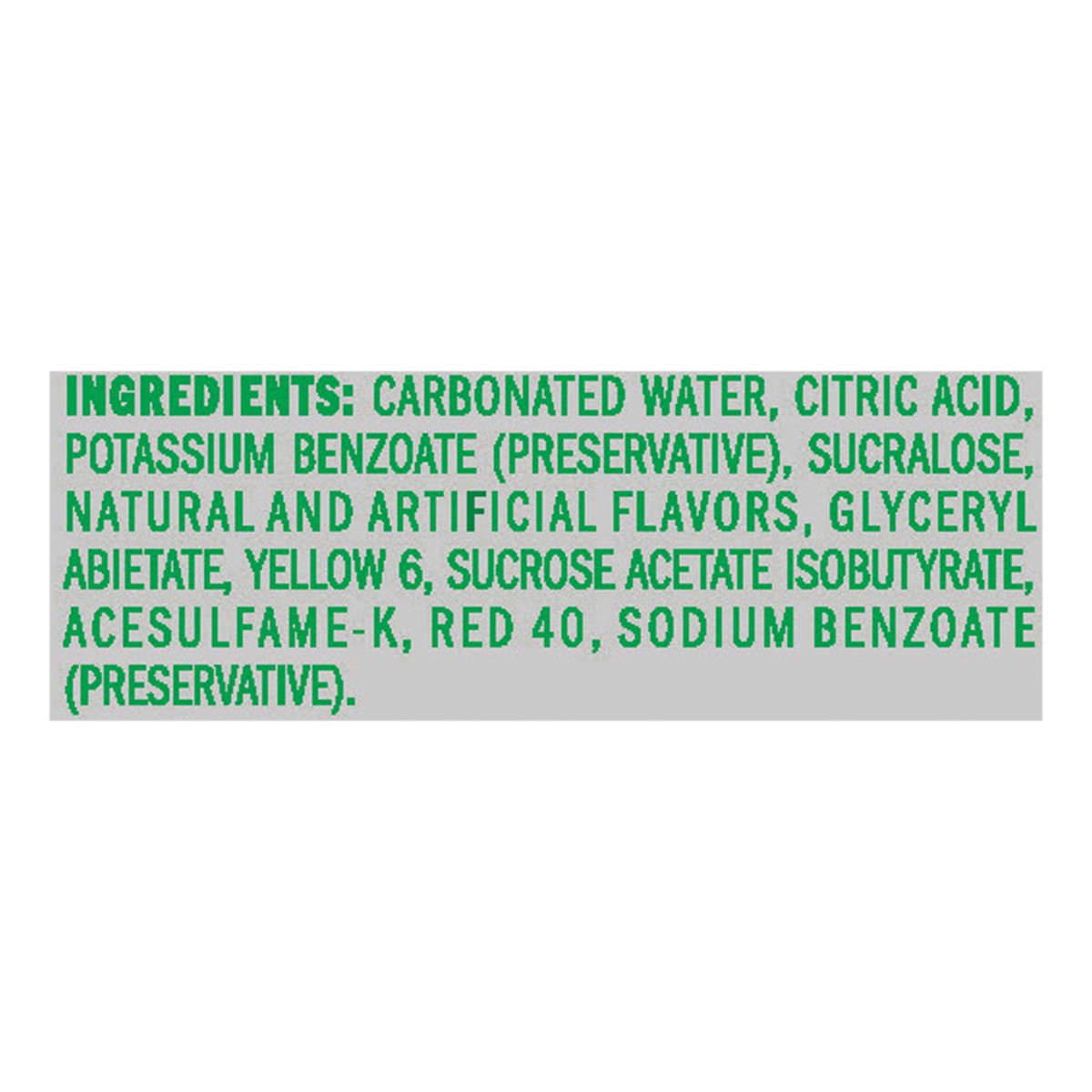 Carbonated Water, Citric Acid, Potassium Benzoate (Preservative), Sucralose, Natural and Artificial Flavors, Glyceryl Abietate, Yellow 6, Sucrose Acetate Isobutyrate, Acesulfame-K, Red 40, Sodium Benz…