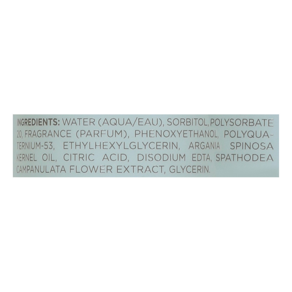 Water (Aqua/Eau), Sorbitol, Polysorbate 20, Fragrance (Parfum), Phenoxyethanol, Polyquaternium-53, Ethylhexylglycerin, Argania Spinosa Kernel Oi, Citric Acid, Disodium EDTA, Spathodea Campanulata Flow…