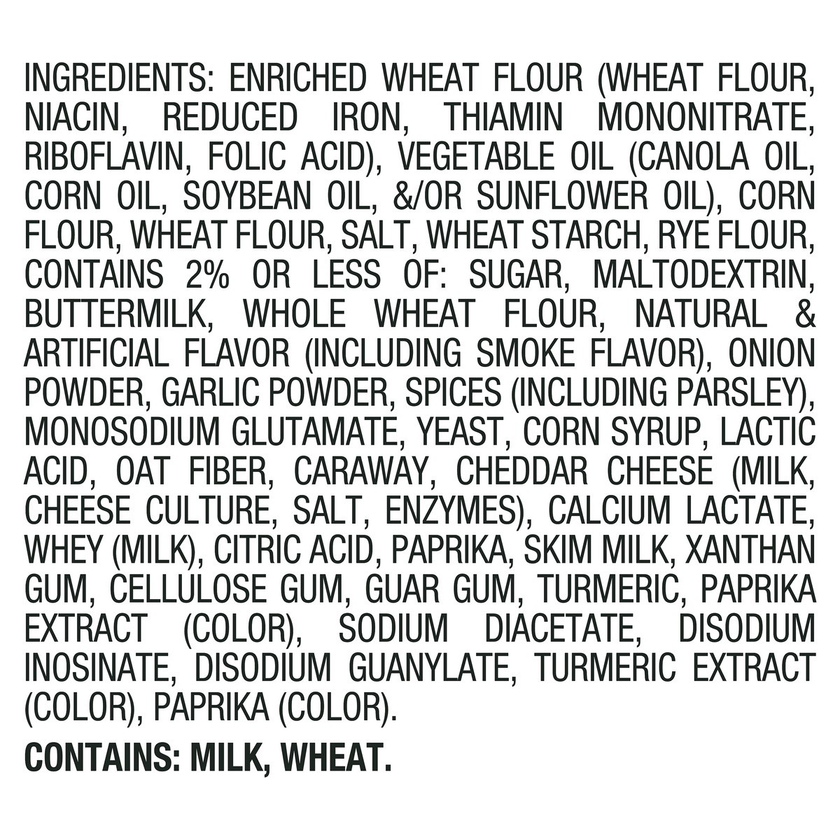 Enriched Wheat Flour (Wheat Flour, Niacin, Reduced Iron, Thiamin Mononitrate, Riboflavin, Folic Acid), Vegetable Oil (Canola Oil, Corn Oil, Soybean Oil, &/or Sunflower Oil), Corn Flour, Wheat Flour, S…