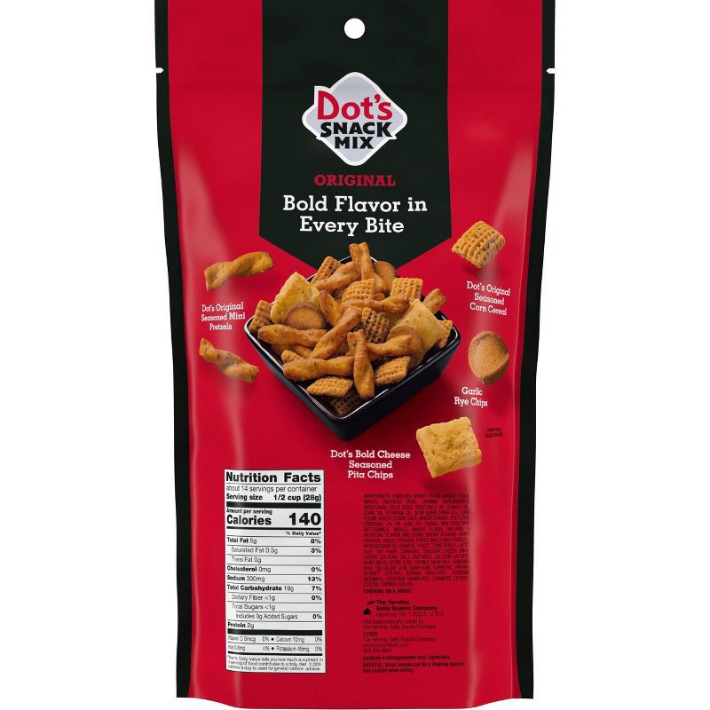 - Dot's Snack Mix featuring Dot's® Original seasoned Mini Pretzels, and Dot's® Original Seasoned Corn Cereal Pieces, Dot's® Bold Cheese Seasoned Pita Chips, and Garlic Rye Chips