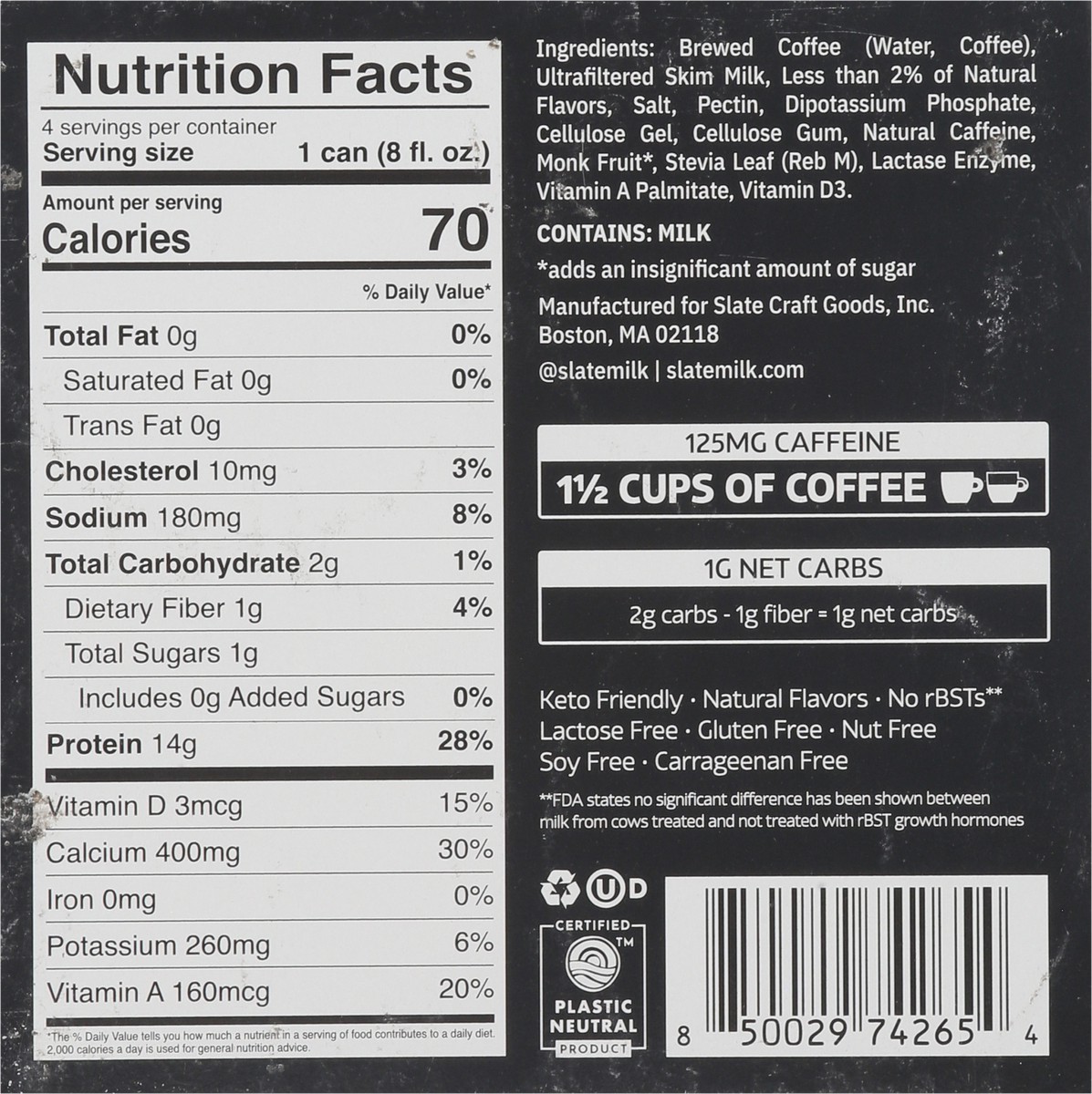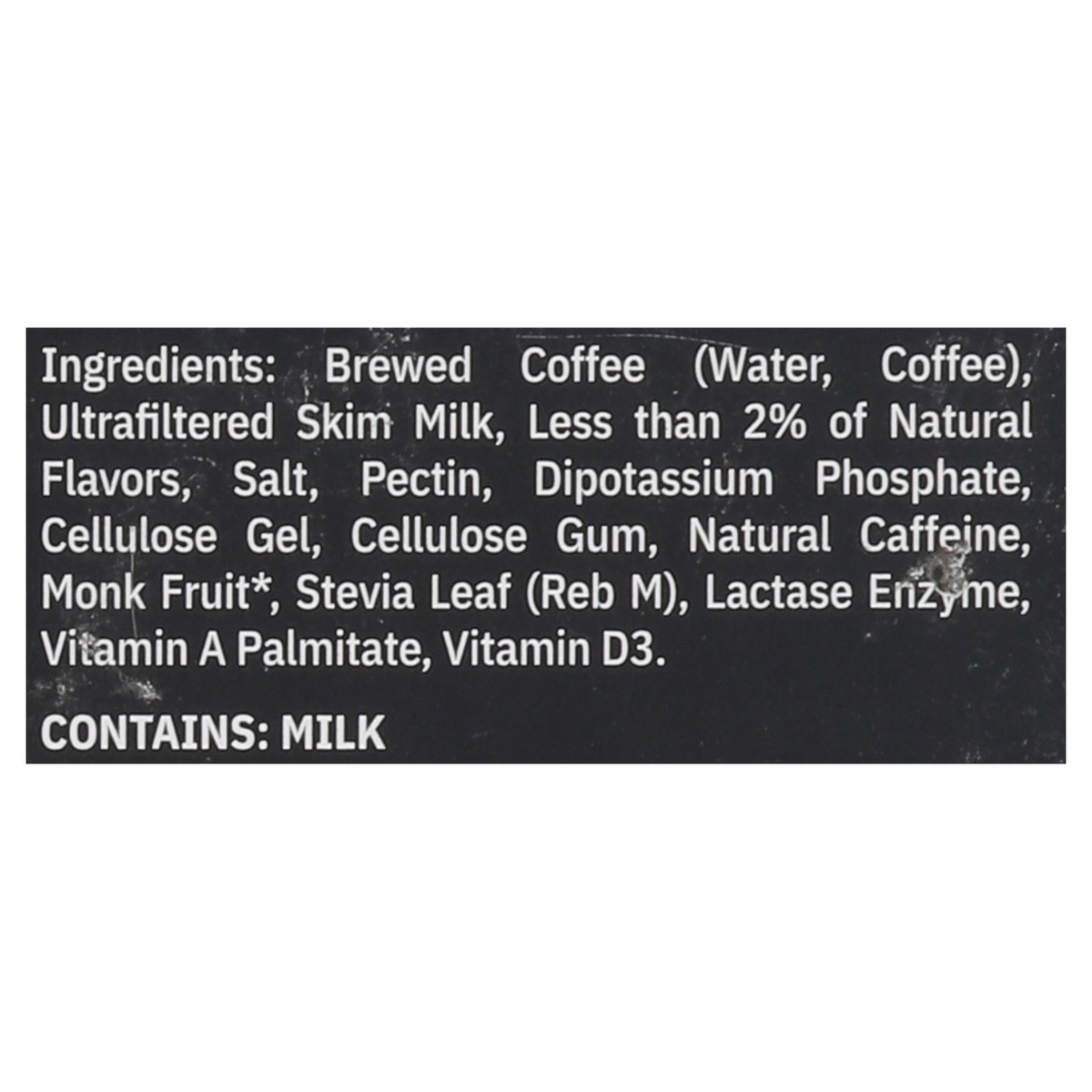 Brewed Coffee (Water, Coffee), Ultrafiltered Skim Milk, Less than 2% of Natural Flavors, Salt, Pectin, Dipotassium Phosphate, Cellulose Gel, Cellulose Gum, Natural Caffeine, Monk Fruit (Adds an Insign…