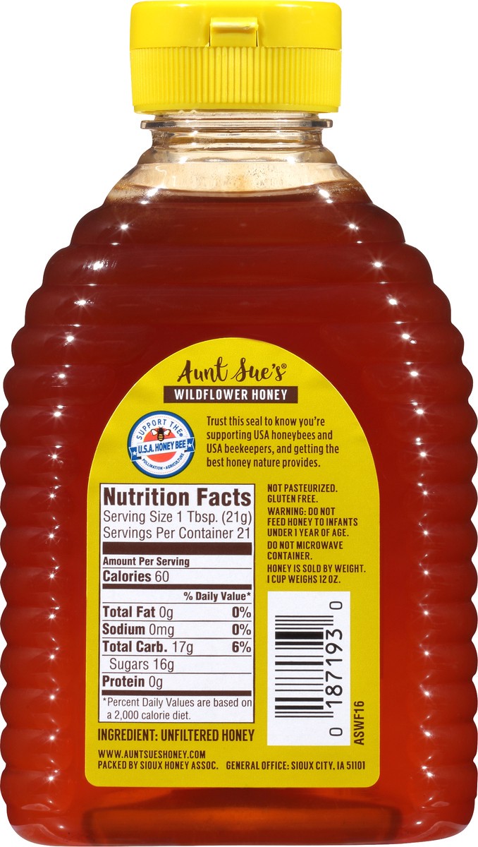 Pure honey. Gluten free. Not pasteurized. Honey is sold by weight. 1 cup weighs 12 oz. US Grade A. www.auntsueshoney.com. Support the U.S.A. Honey Bee Pollination Agriculture. Trust this seal to know …