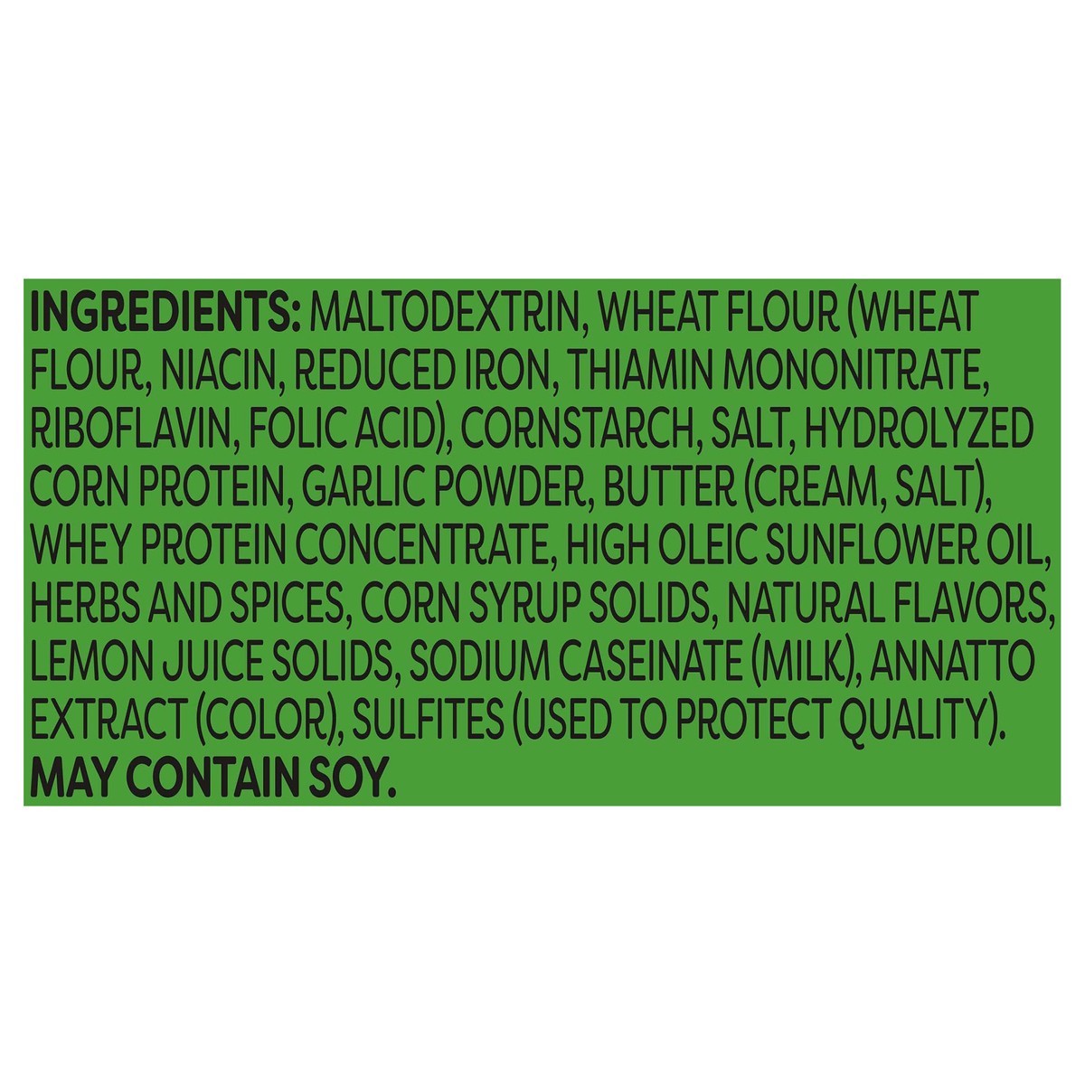 Maltodextrin, Wheat Flour (Wheat Flour, Niacin, Reduced Iron, Thiamin Mononitrate, Riboflavin, Folic Acid), Cornstarch, Salt, Hydrolyzed Corn Protein, Garlic Powder, Butter (Cream, Salt), Whey Protein…