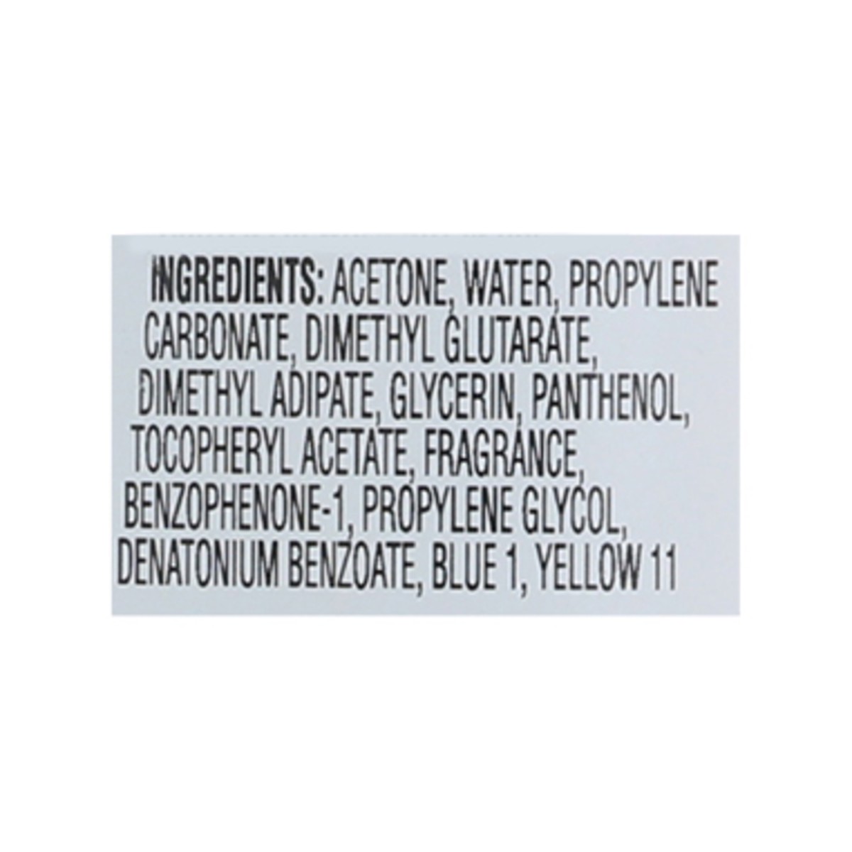 Acetone, Water, Propylene Carbonate, Dimethyl Glutarate, Dimethyl Adipate, Glycerin, Panthenol, Tocopheryl Acetate, Fragrance, Benzophenone-1, Propylene Glycol, Denatonium Benzoate, Blue 1, Yellow 11.