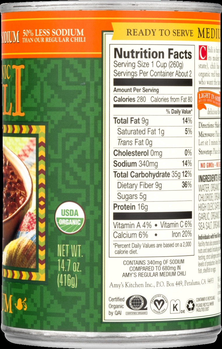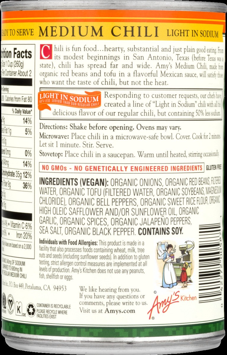 Amy's Kitchen Organic Chili, Light in Sodium, Medium, Vegan, 14.7 oz
