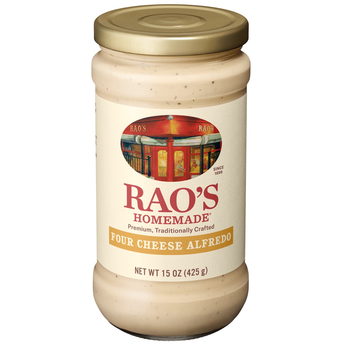 - Rao’s Homemade Four Cheese Alfredo Sauce combines Parmesan, Romano, Asiago, and Fontina cheeses to create a decadent, premium sauce