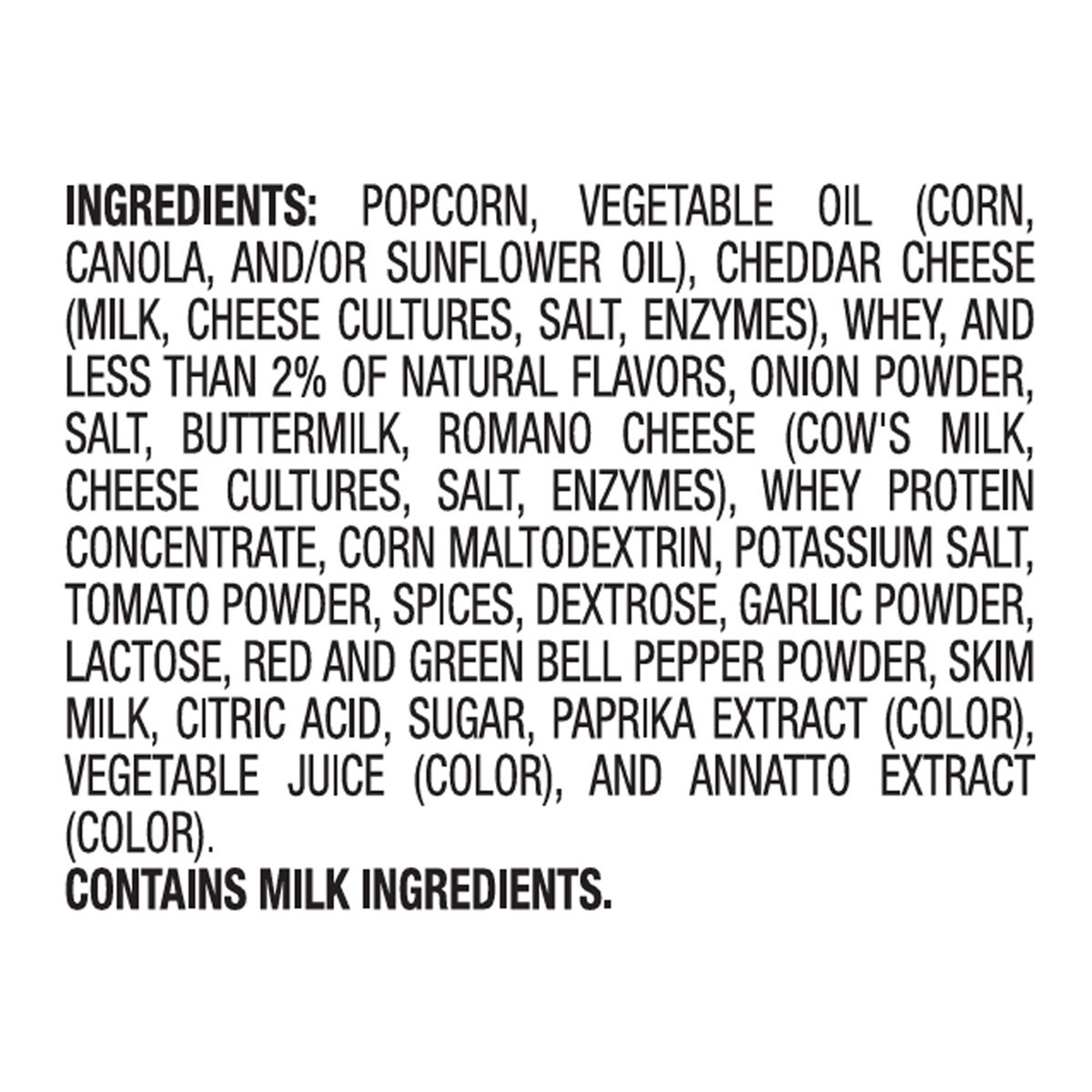 Popcorn, Vegetable Oil (Corn, Canola, and/or Sunflower Oil), Cheddar Cheese (Milk, Cheese Cultures, Salt, Enzymes), Whey, and Less than 2% of Natural Flavors, Onion Powder, Salt, Buttermilk, Romano Ch…
