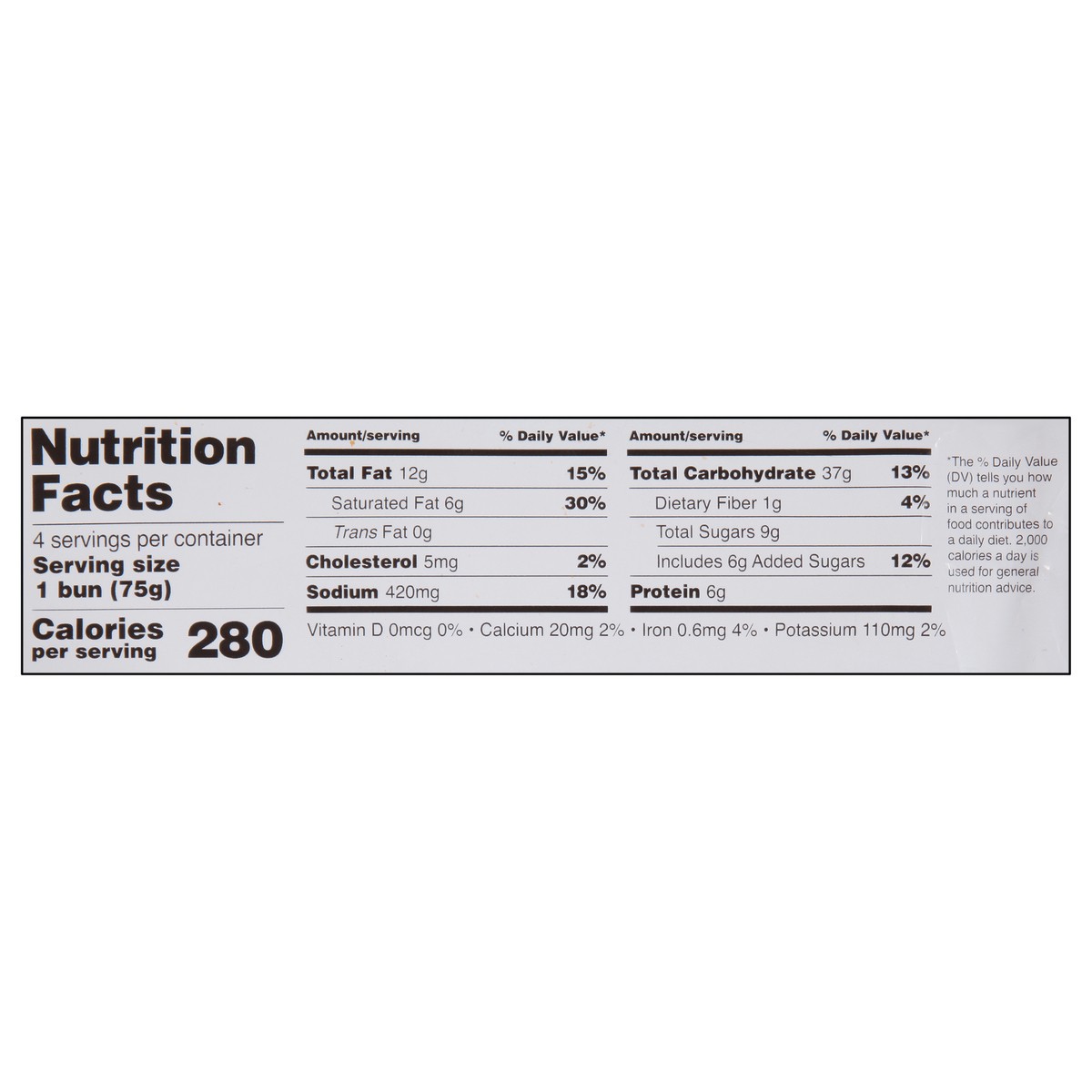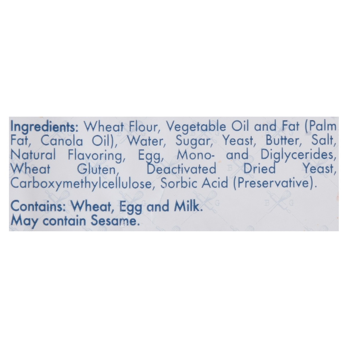 Wheat Flour, Vegetable Oil and Fat (Palm Fat, Canola Oil), Water, Sugar, Yeast, Butter, Salt, Natural Flavoring, Egg, Mono- and Diglycerides, Wheat Gluten, Deactivated Dried Yeast, Carboxymethylcellul…