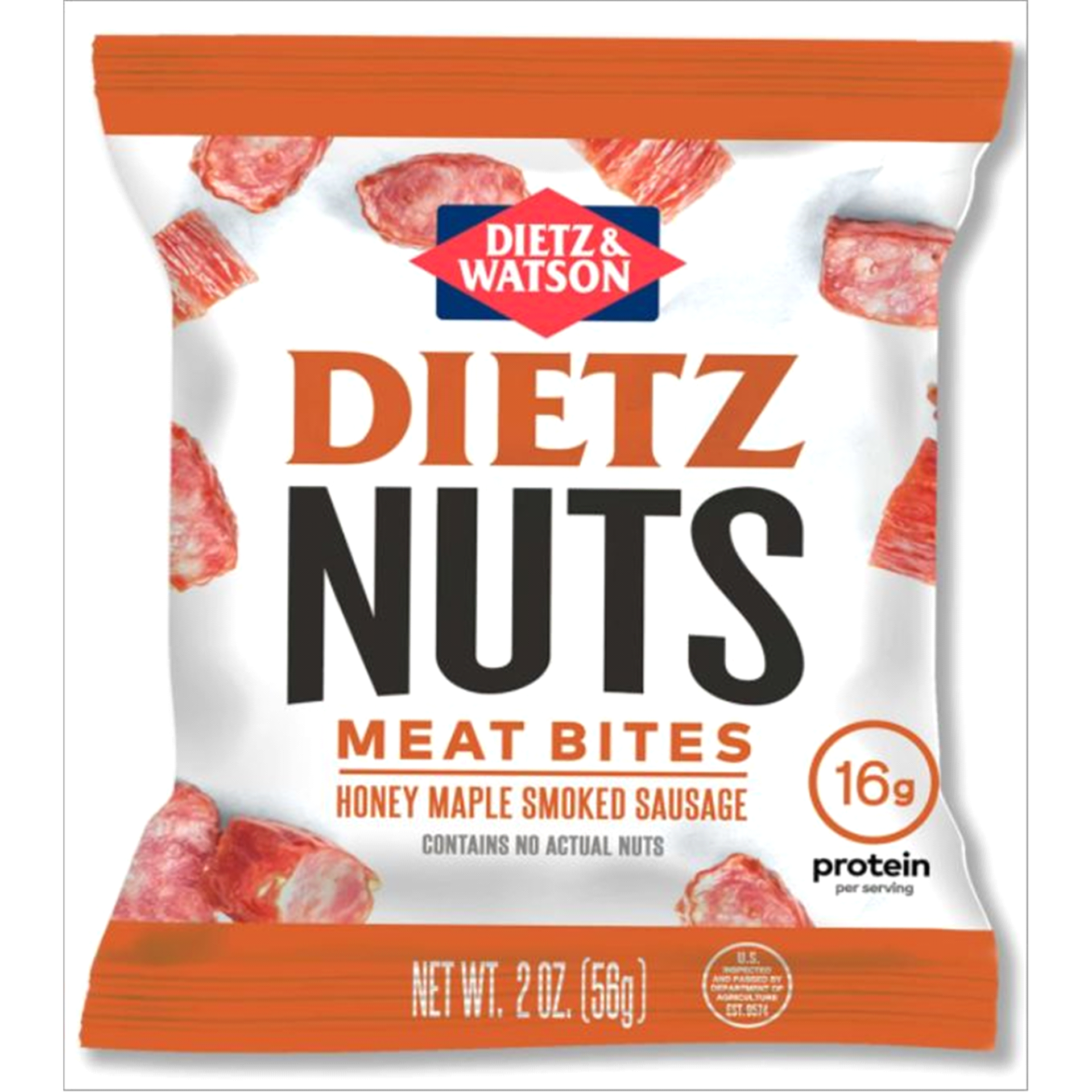16 g protein per serving. Contains no actual nuts. Made from our famous landjaeger. You're going to like Dietz Nuts. US inspected and passed by Department of Agriculture. (hashtag)ItsAFamilyThing.