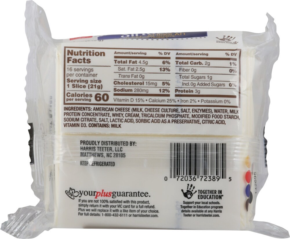 Pasteurized prepared cheese product. Per 1 Slice: 60 calories. Yourplusguarantee. If you are not 100% satisfied with this product, simply return it with your VIC card for a full refund. Plus we will r…
