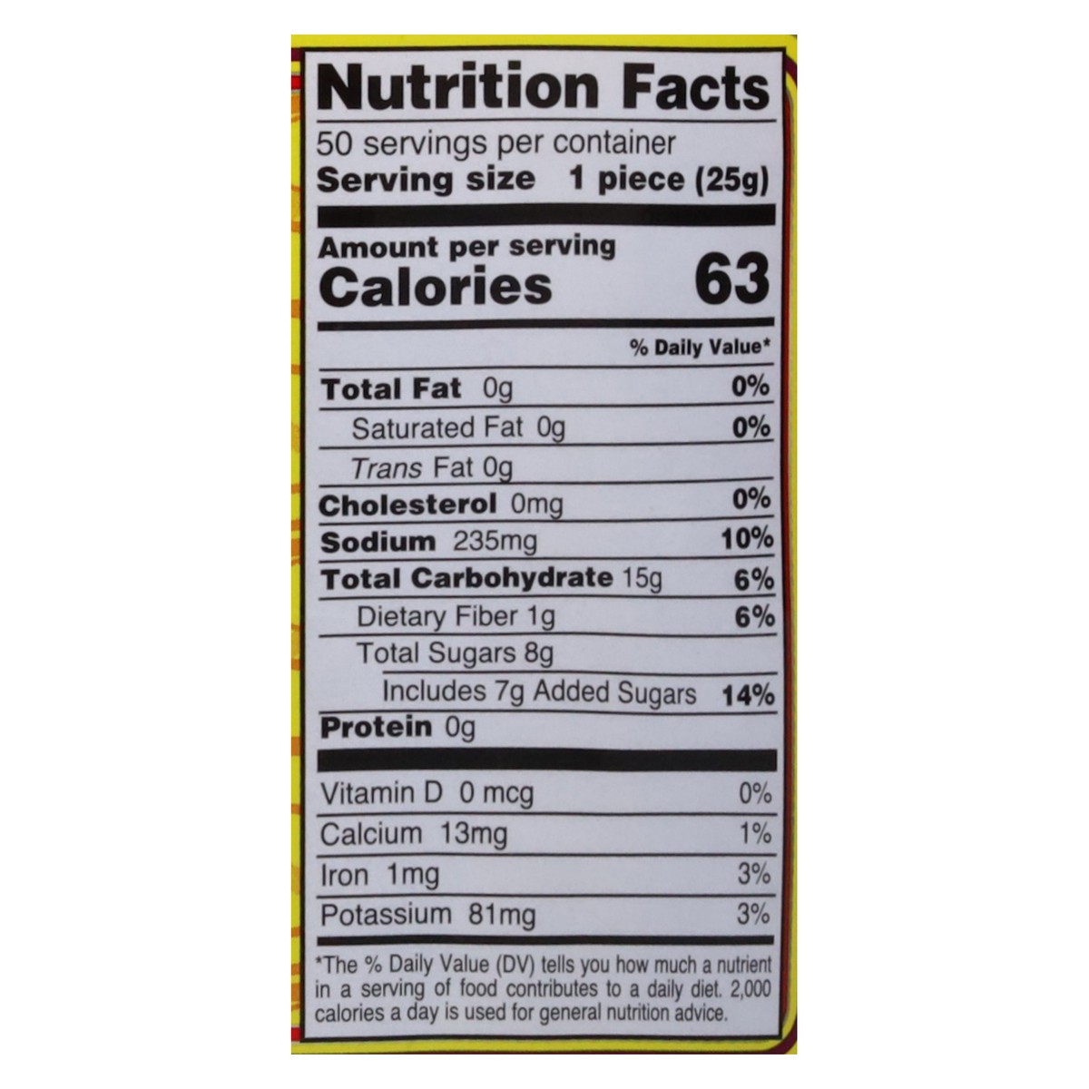 Hawthorm Apple, Quince, Sugar, Corn Syrup, Chili, Salt, Citric Acid, Xanthan Gum, Sodium Benzoate as Preservative, Artificial Tamarind Flavor, Artificial Color FD&C Red #40, Maltodextrine and Soy.
