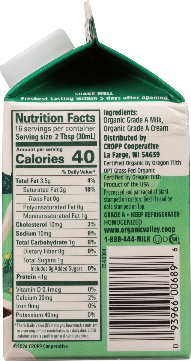 Organic Valley Grassmilk Half & Half Organic 1 Pint - 473 Ml