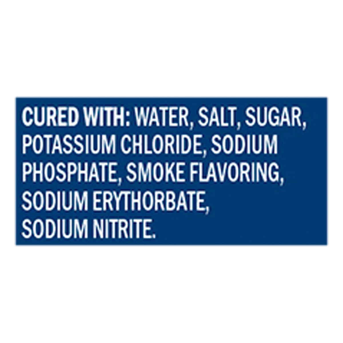 Cured with: Water, Salt, Sugar, Potassium Chloride, Sodium Phosphate, Smoke Flavoring, Sodium Erythorbate, Sodium Nitrite.
