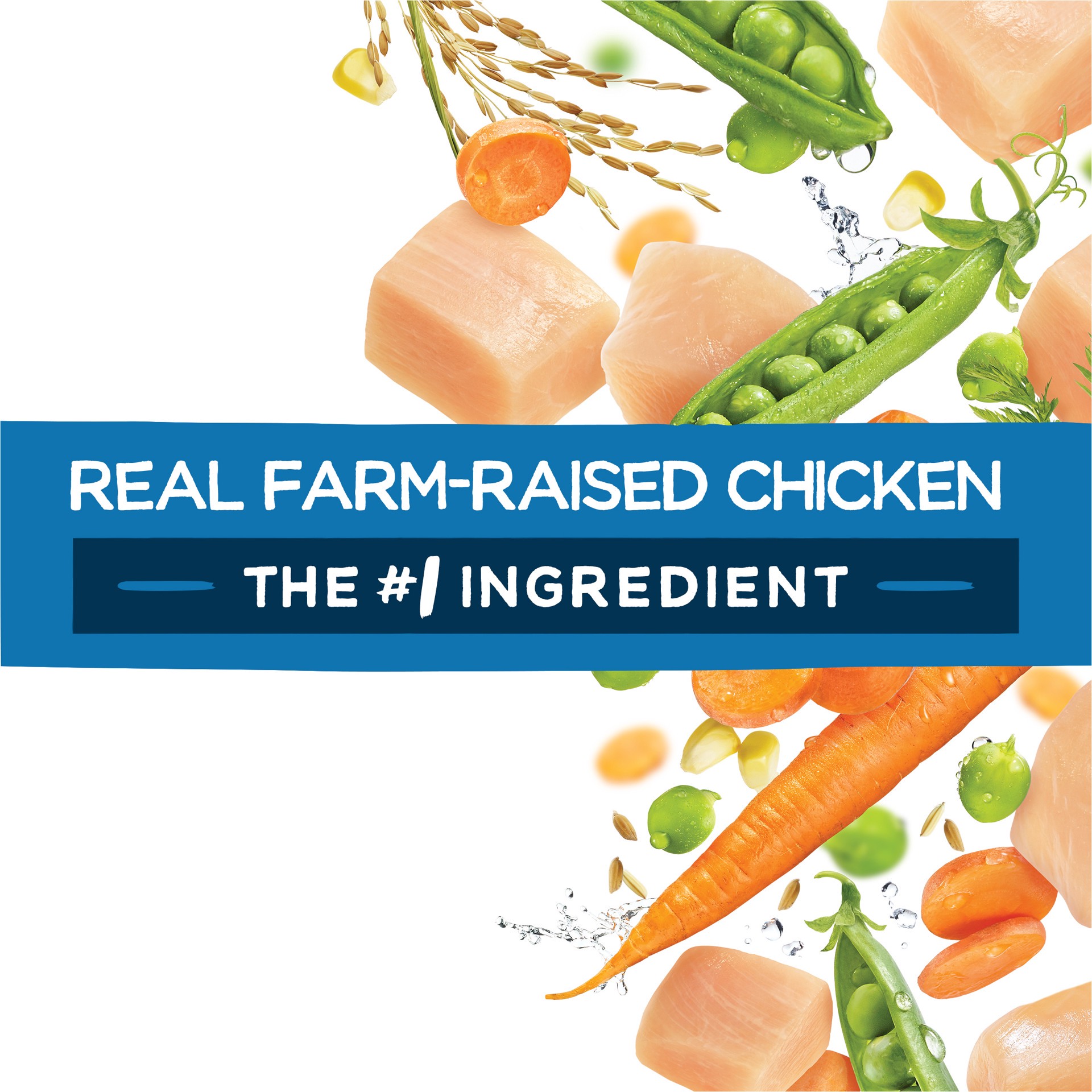 - Dry puppy food featuring Real chicken is the number one ingredient and includes accents of peas and carrots
