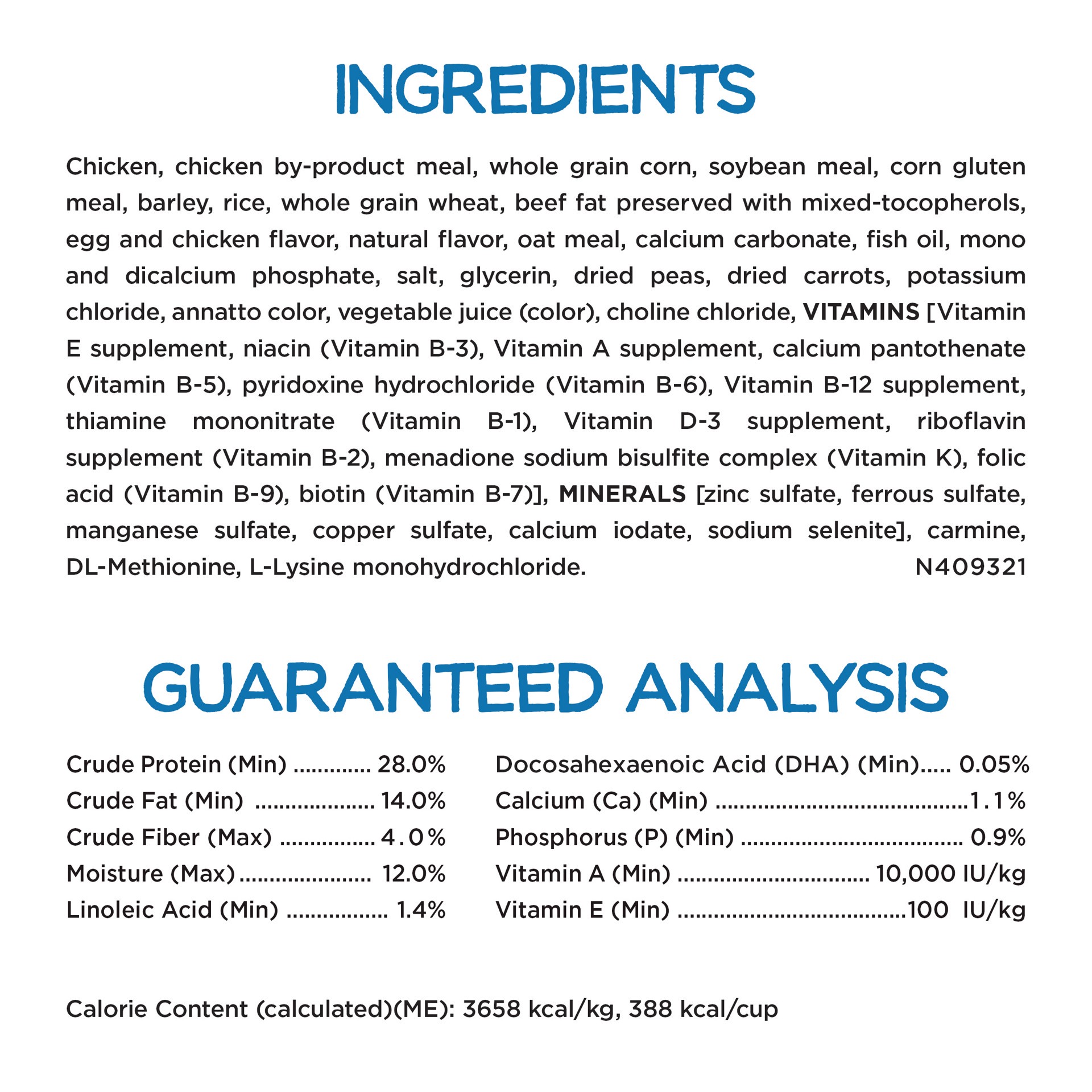 Chicken, Whole Grain Corn, Chicken By-Product Meal , Soybean Meal, Corn Protein Meal, Barley, Rice, Whole Grain Wheat, Beef Fat Preserved With Mixed-Tocopherols, Egg And Chicken Flavor, Natural Flavor…