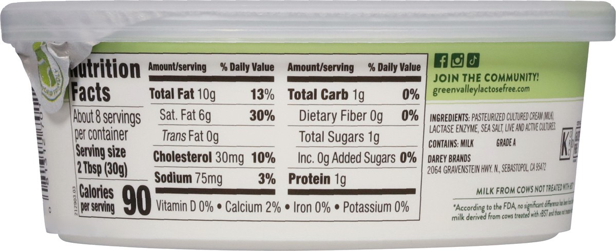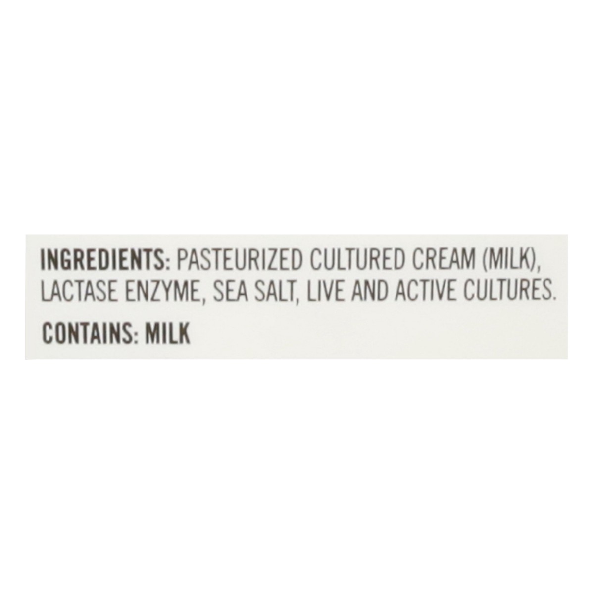 Pasteurized Cultured Cream (Milk), Lactose Enzyme, Sea Salt, and Live and Active Cultures.