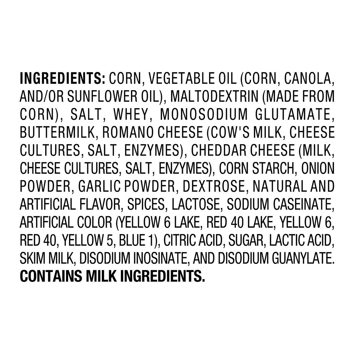 Corn, Vegetable Oil (Corn, Canola, and/or Sunflower Oil), Maltodextrin (Made from Corn), Salt, Whey, Monosodium Glutamate, Buttermilk, Romano Cheese (Cow''s Milk, Cheese Cultures, Salt, Enzymes), Ched…