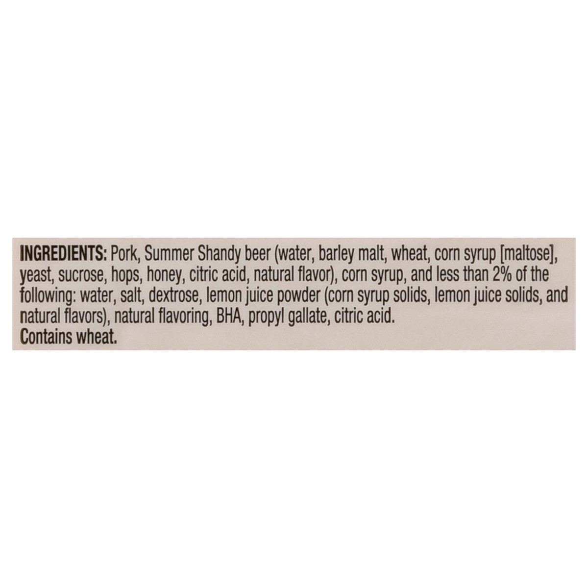 Pork, Summer Shandy Beer (Water, Barley Malt, Wheat, Corn Syrup [Maltose], Yeast, Sucrose, Hops, Honey, Citric Acid, Natural Flavor), Corn Syrup, and Less than 2% of the Following: Water, Salt, Dextro…