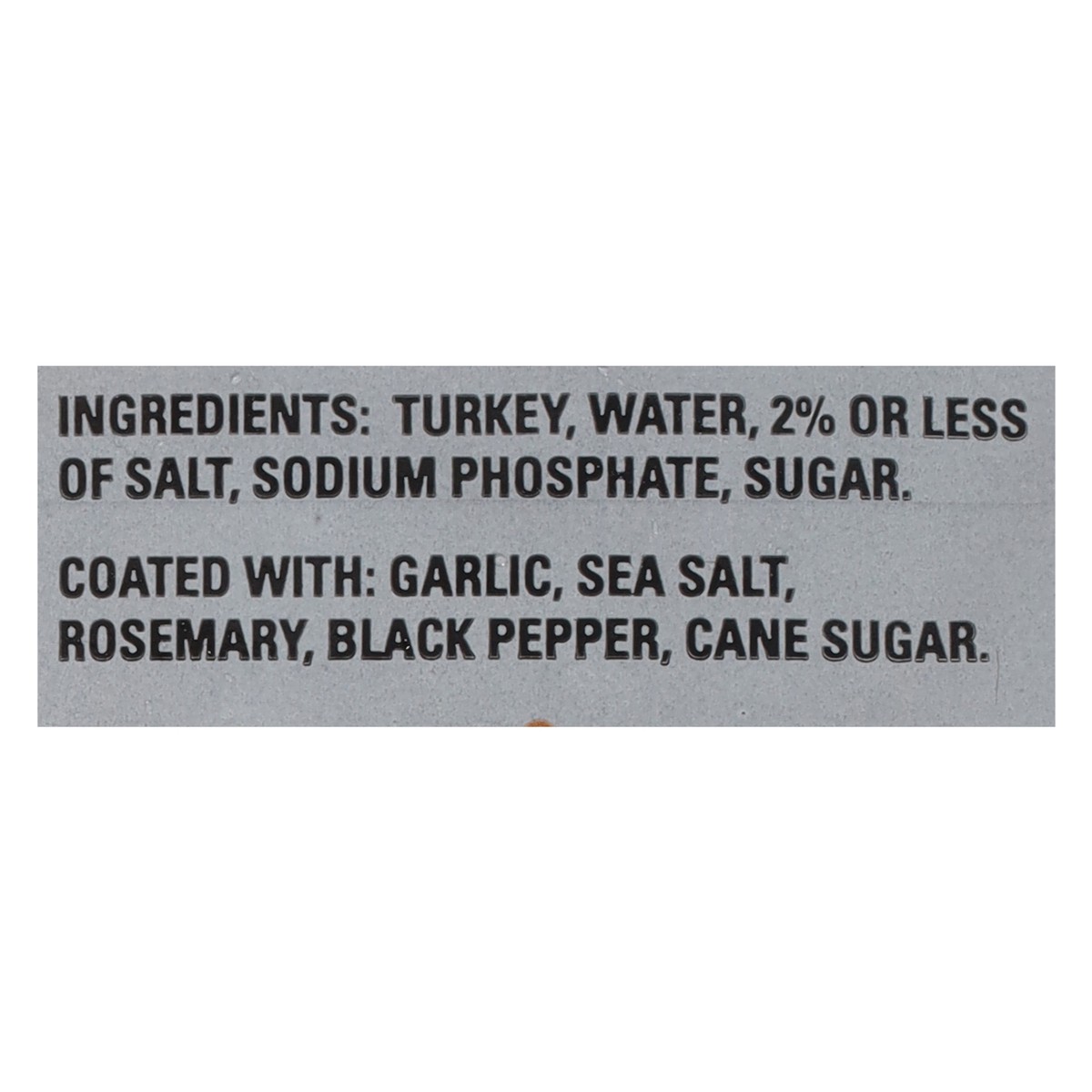 Turkey, Water, 2% or Less of Salt, Sodium Phosphate, Sugar. Coated with: Garlic, Sea Salt, Rosemary, Black Pepper, Cane Sugar.