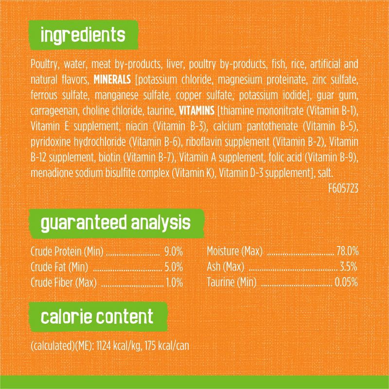 Poultry, Water, Meat By-Products, Liver, Poultry By-Products, Fish, Rice, Artificial and Natural Flavors, Minerals [Potassium Chloride, Magnesium Proteinate, Zinc Sulfate, Ferrous Sulfate, Manganese S…