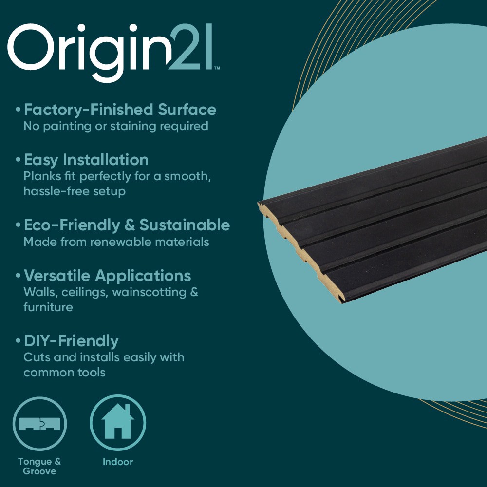 Origin 21 stylish fluted wall panels made from durable MDF(medium density fiberboard). Factory applied finished black surface, ready to install. Each plank has dimensions of 1/2-in thick x 5-1/4-in wi…