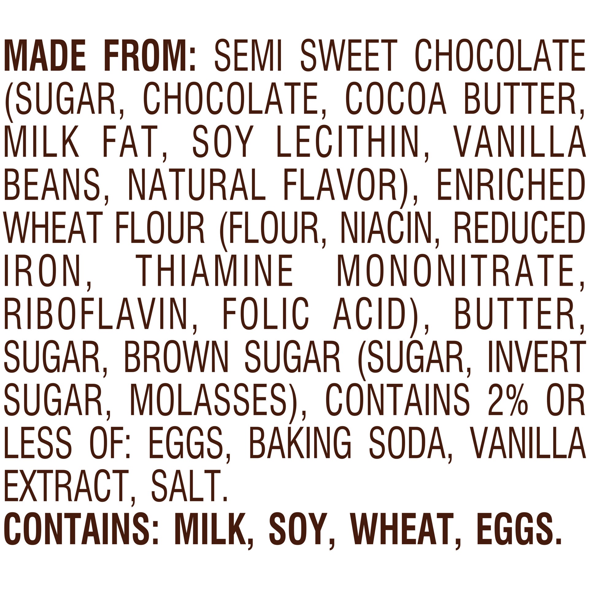 MADE FROM: SEMI SWEET CHOCOLATE (SUGAR, CHOCOLATE, COCOA BUTTER, MILK FAT, SOY LECITHIN, VANILLA BEANS, NATURAL FLAVOR), ENRICHED WHEAT FLOUR (FLOUR, NIACIN, REDUCED IRON, THIAMINE MONONITRATE, RIBOFL…