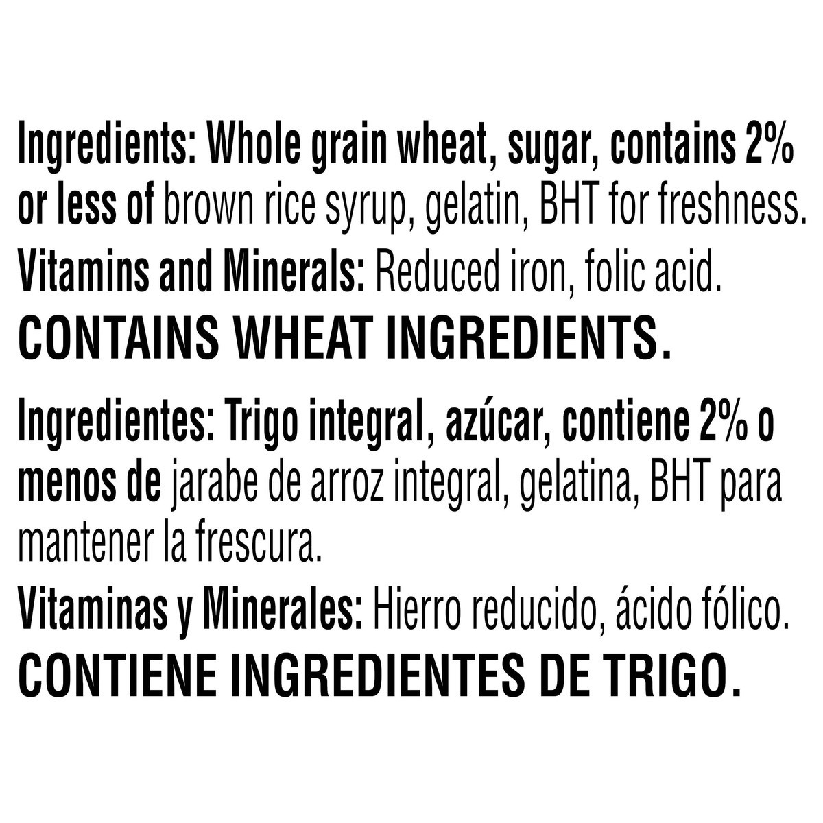 Whole Grain Wheat, Sugar, Contains 2% or Less of Brown Rice Syrup, Gelatin, BHT for Freshness, Vitamins and Minerals: Reduced Iron, Folic Acid.