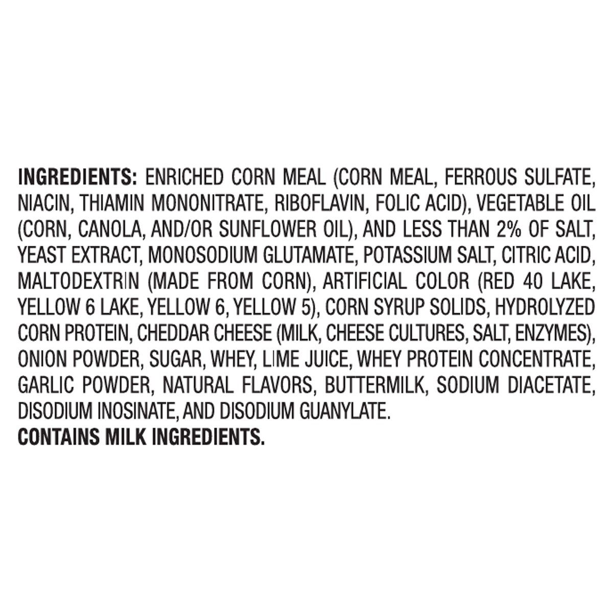 Enriched Corn Meal (Corn Meal, Ferrous Sulfate, Niacin, Thiamin Mononitrate, Riboflavin, Folic Acid), Vegetable Oil (Corn, Canola, and/or Sunflower Oil), and Less than 2% of Salt, Yeast Extract, Monos…