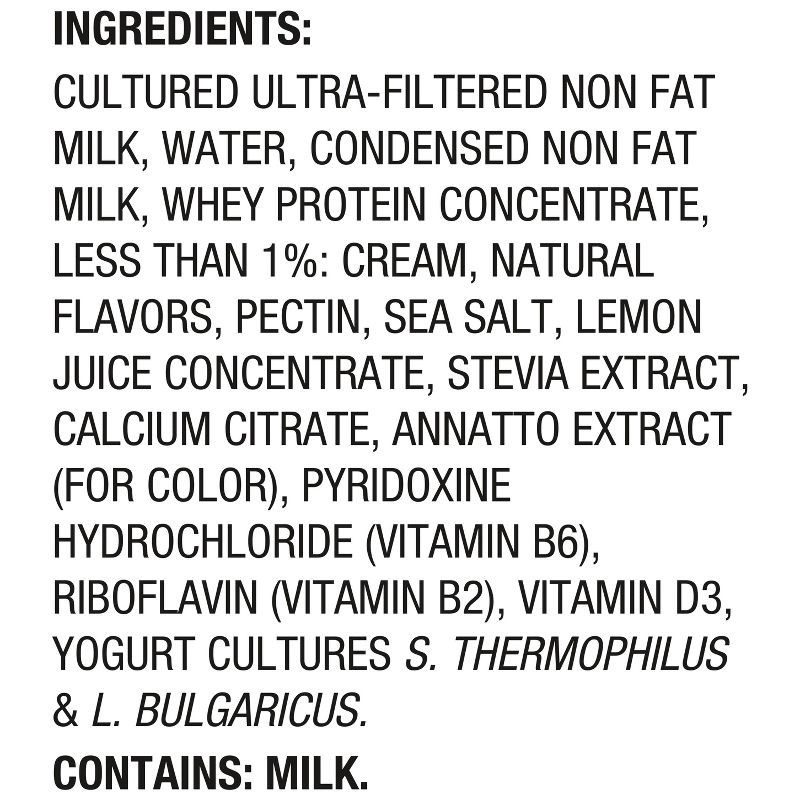 CULTURED ULTRA-FILTERED NON FAT MILK, WATER, CONDENSED NON FAT MILK, WHEY PROTEIN CONCENTRATE, LESS THAN 1%: CREAM, NATURAL FLAVORS, PECTIN, SEA SALT, LEMON JUICE CONCENTRATE, STEVIA EXTRACT, CALCIUM …