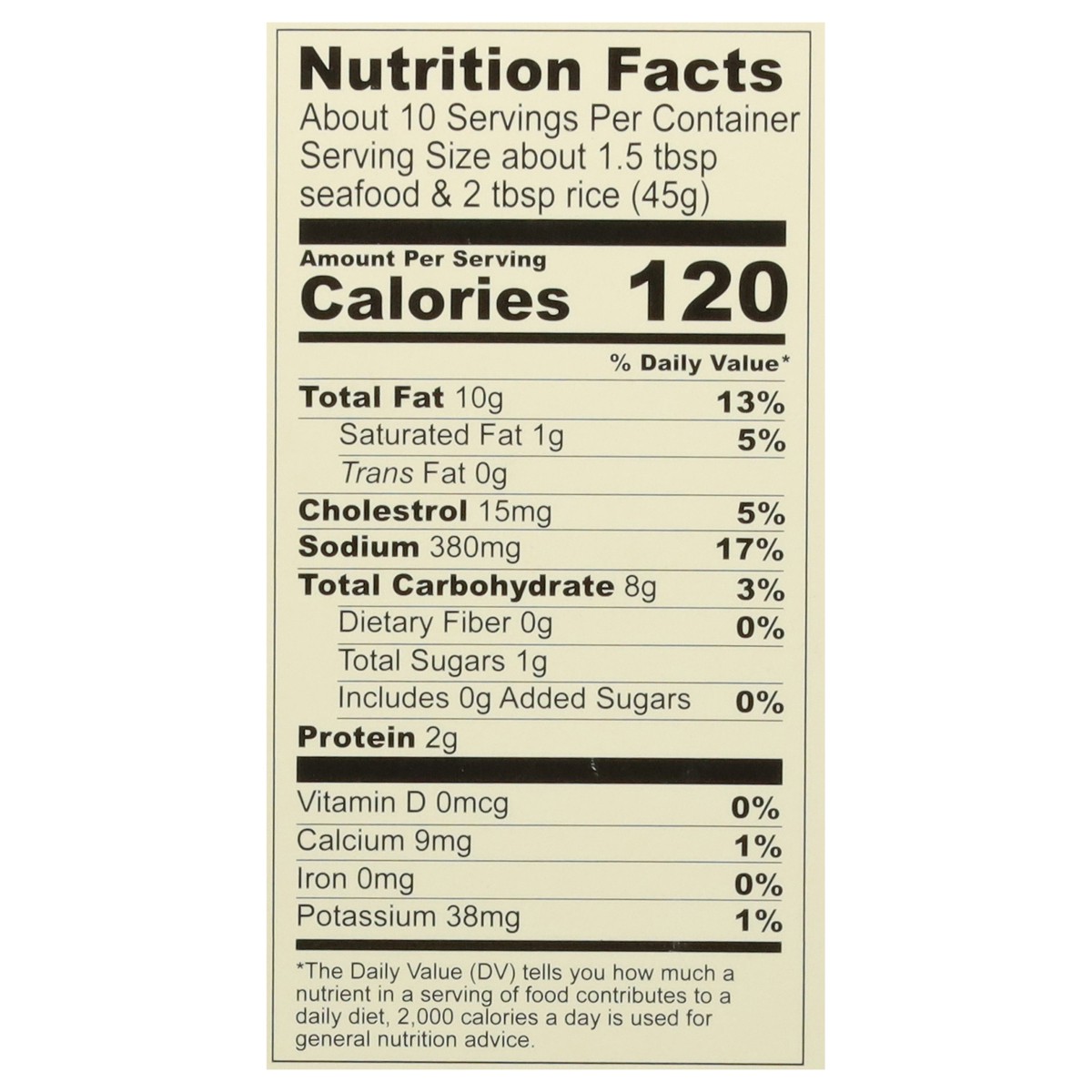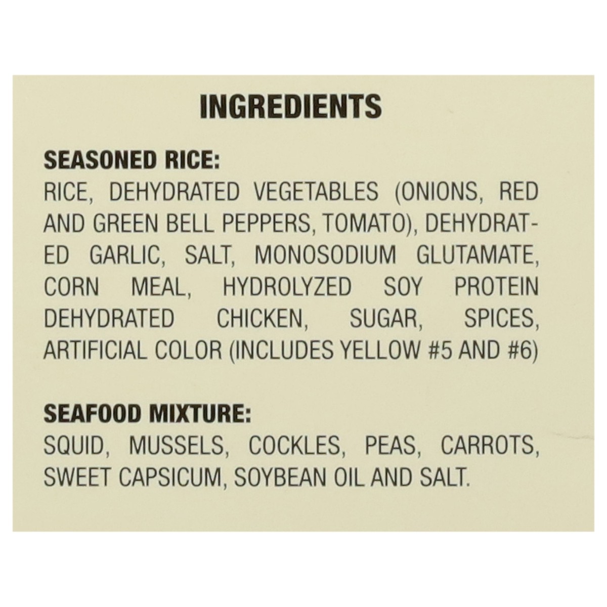 Seasoned Rice: Rice [Enriched with Niacin, Iron (Ortho Phosphate), Thiamin and Riboflavin], Dehydrated Onion, Dehydrated Peppers, Dehydrated Tomato, Salt, Monosodium Glutamate, Cornmeal, Garlic, Hydro…