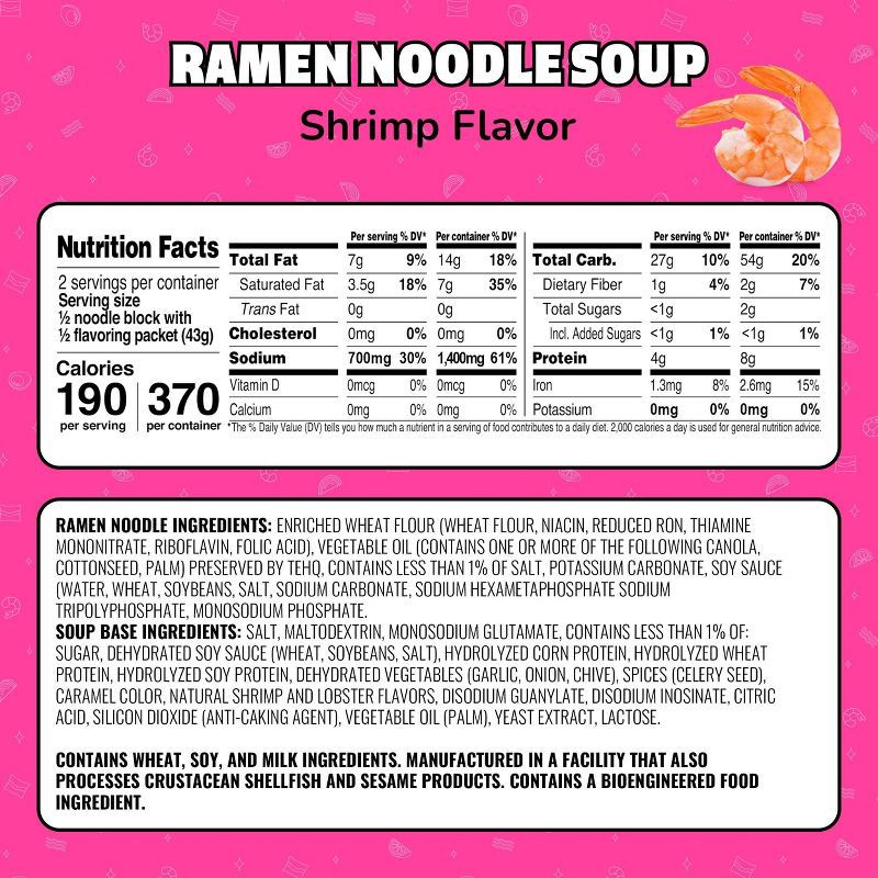 Ramen Noodle Ingredients: Enriched Wheat Flour (Wheat Flour, Niacin, Reduced Iron, Thiamine Mononitrate, Riboflavin, Folic Acid), Vegetable Oil (Contains One or More of the Following: Canola, Cottonse…