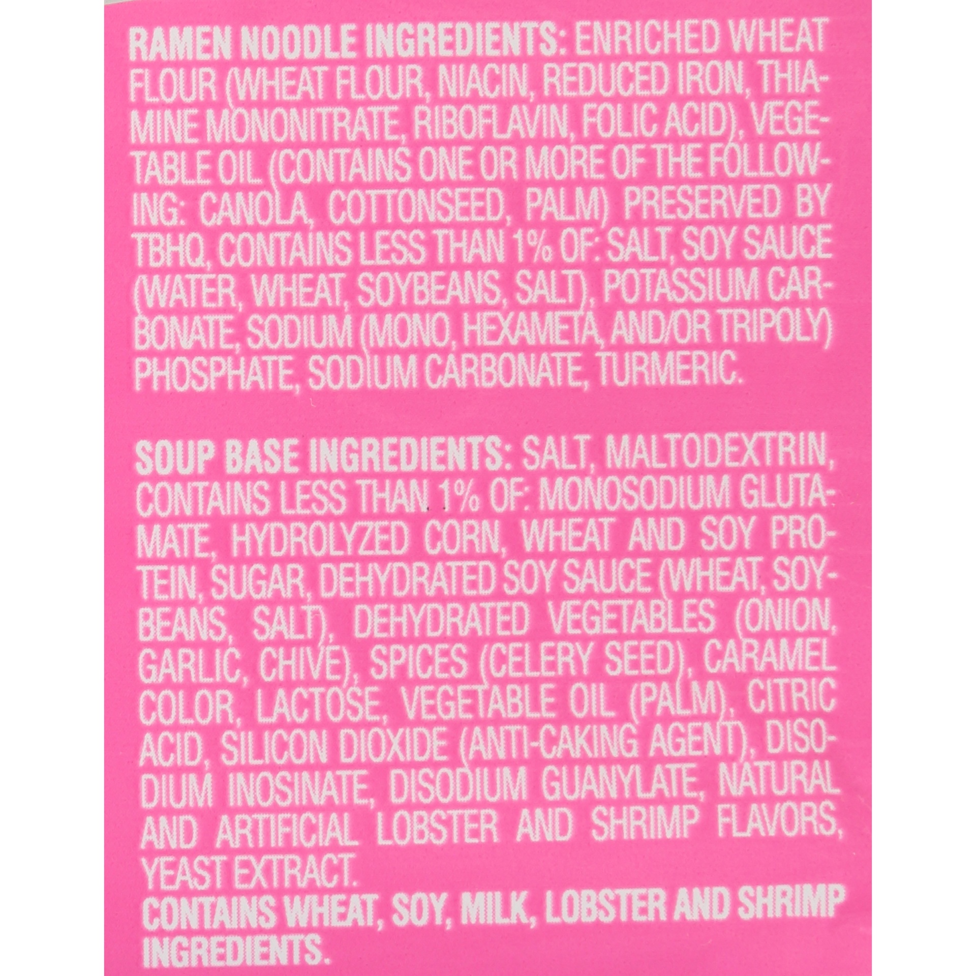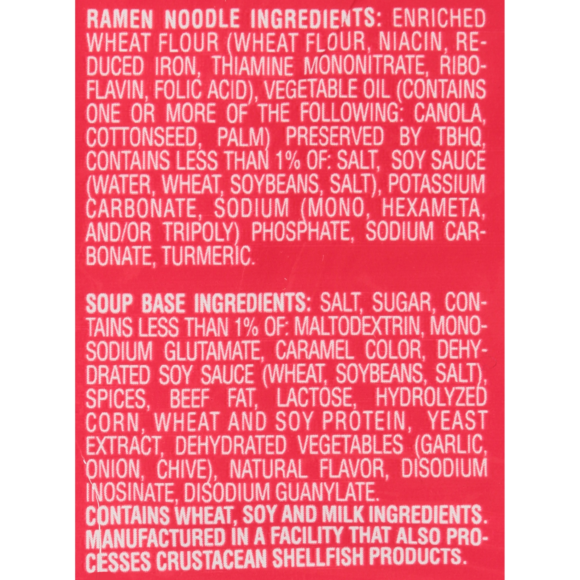 Ramen Noodle Ingredients: Enriched Wheat Flour (Wheat Flour\, Niacin\, Reduced Iron\, Thiamine Mononitrate\, Riboflavin\, Folic Acid)\, Vegetable Oil (Contains One or More of the Following: Canola\, C…
