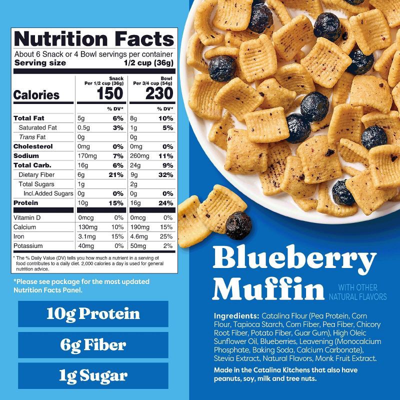 Catalina Flour (Pea Protein, Corn Flour, Tapioca Starch Corn Fiber, Pea Fiber, Chicory Root Fiber, Potato Fiber, Guar Gum), High Oleic Sunflower Oil, Blueberries, Leavening (Monocalcium Phosphate, Bak…