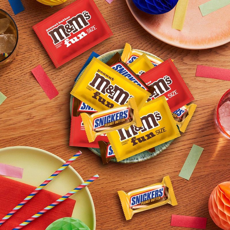 - Features a fun size assortment of SNICKERS Original Milk Chocolate Candy Bars, SNICKERS Crunchy Peanut Butter Milk Chocolate Candy Bars, M&M'S Peanut, and M&M'S Peanut Butter Candy