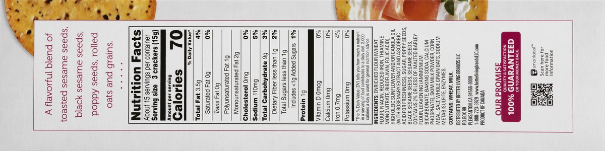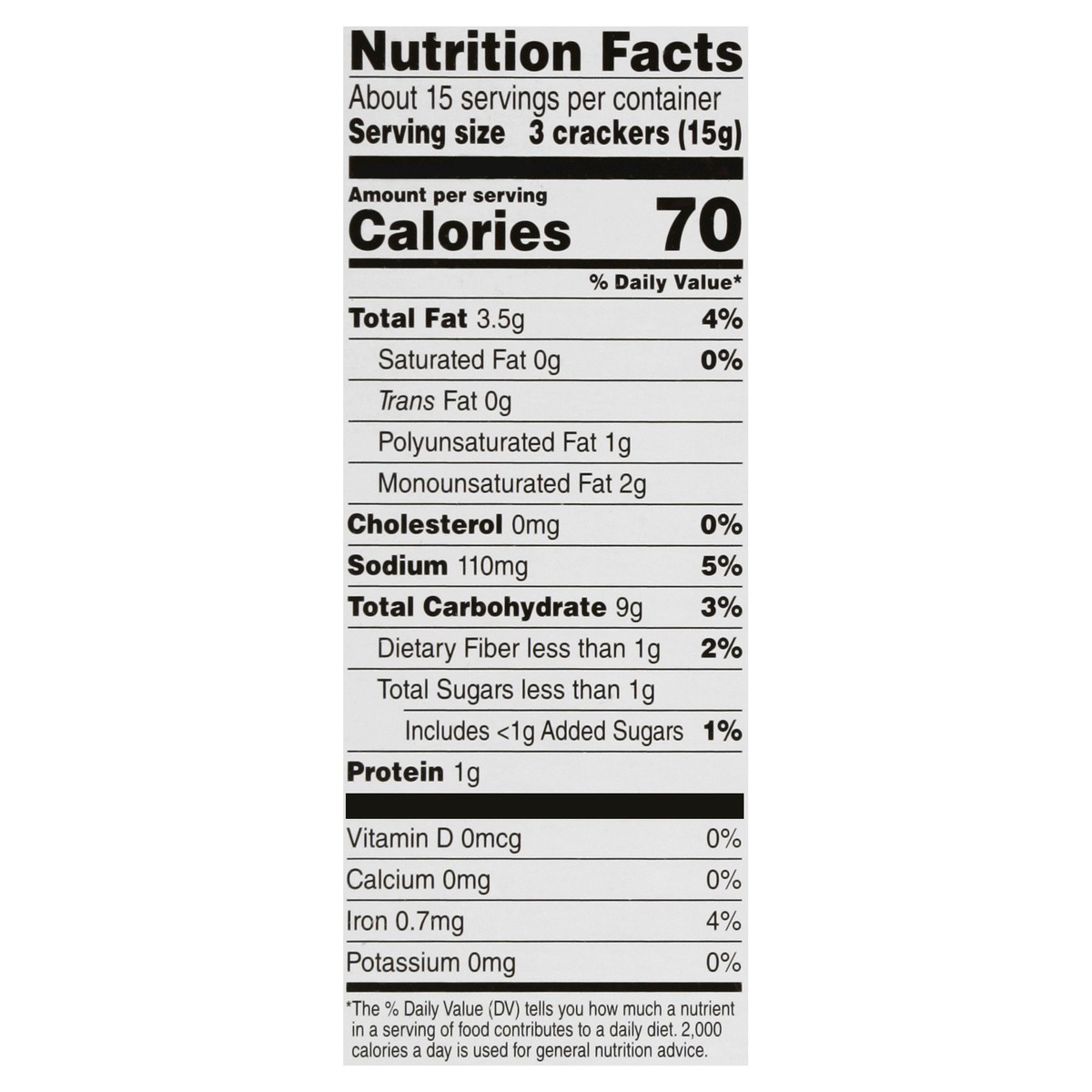 Per 3 Crackers: 70 calories; 0 g sat fat (0% DV); 110 mg sodium (5% DV); less than 1 g total sugars. Baked without artificial flavors & colors. A flavorful blend of toasted sesame seeds, black sesame …