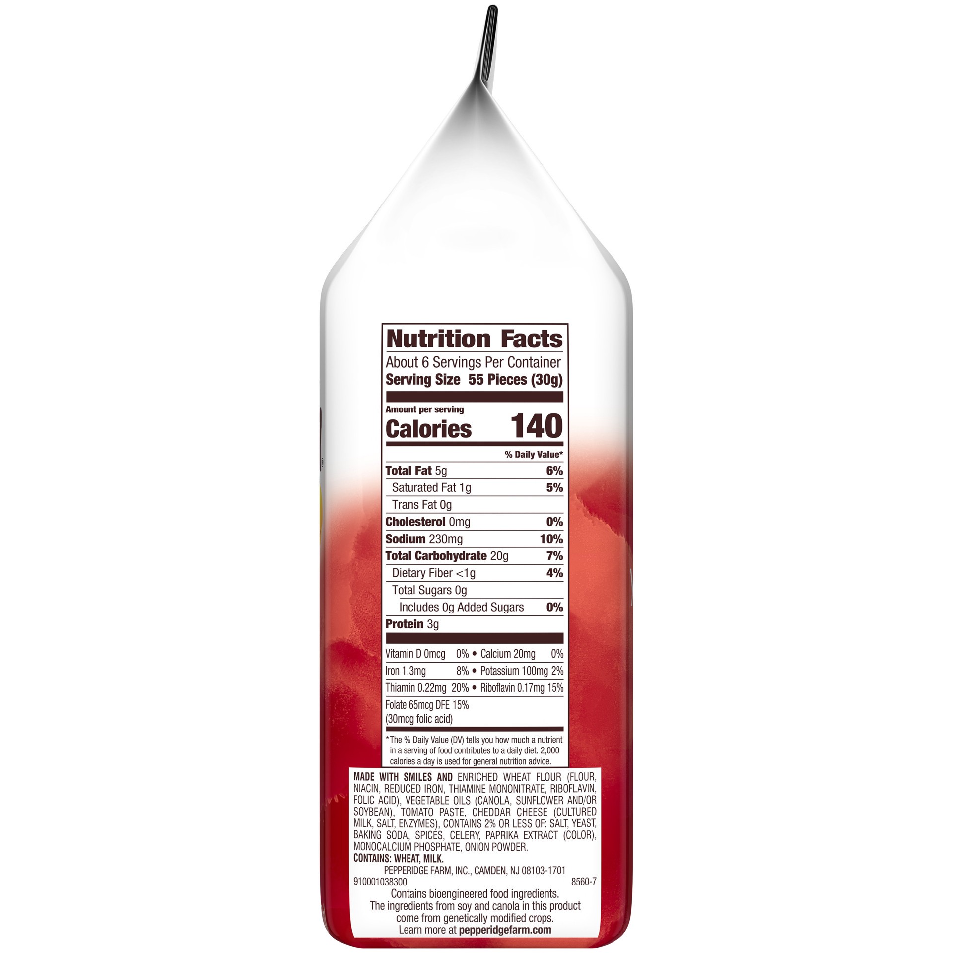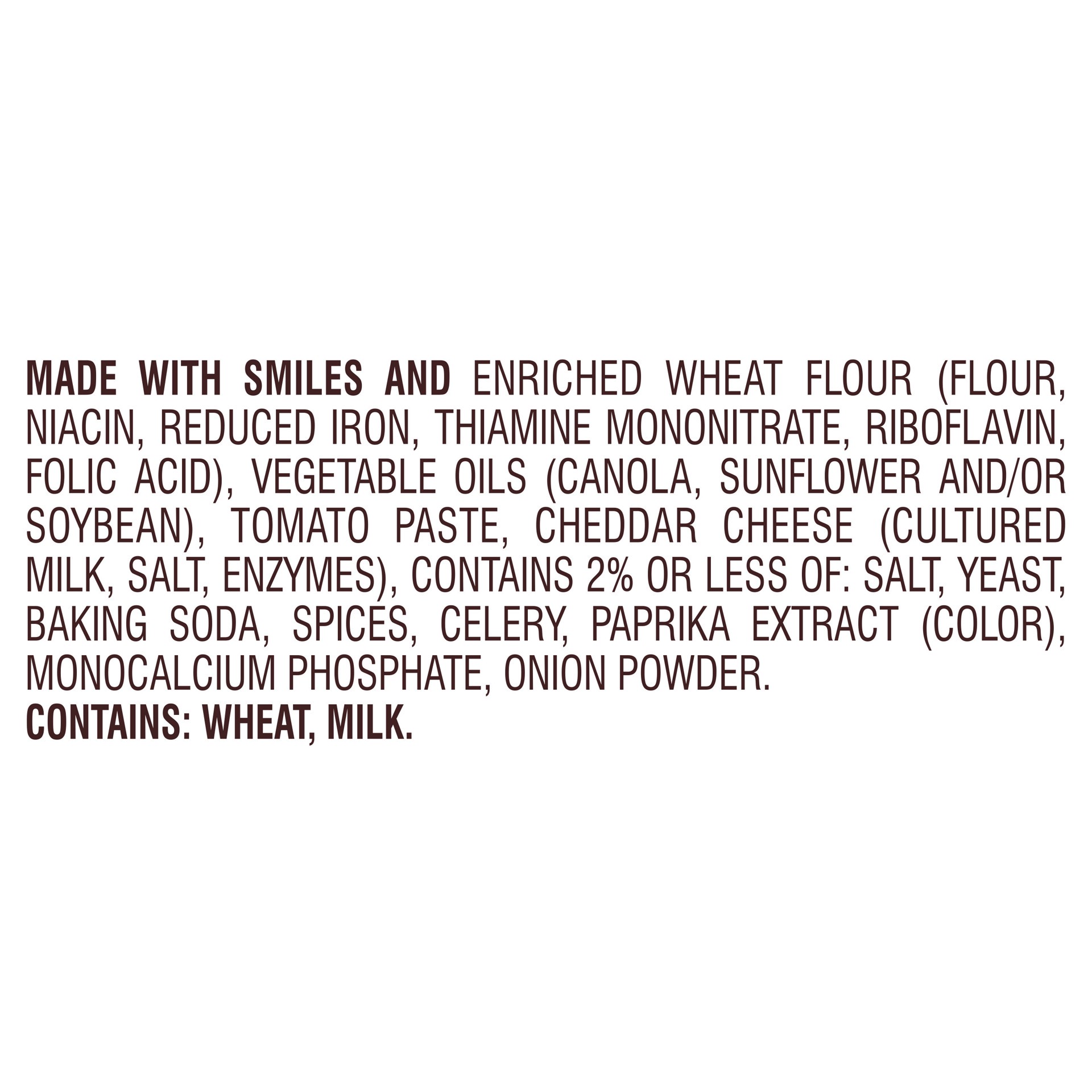 MADE WITH SMILES AND ENRICHED WHEAT FLOUR (FLOUR, NIACIN, REDUCED IRON, THIAMINE MONONITRATE, RIBOFLAVIN, FOLIC ACID), VEGETABLE OILS (CANOLA, SUNFLOWER AND/OR SOYBEAN), TOMATO PASTE, CHEDDAR CHEESE (…