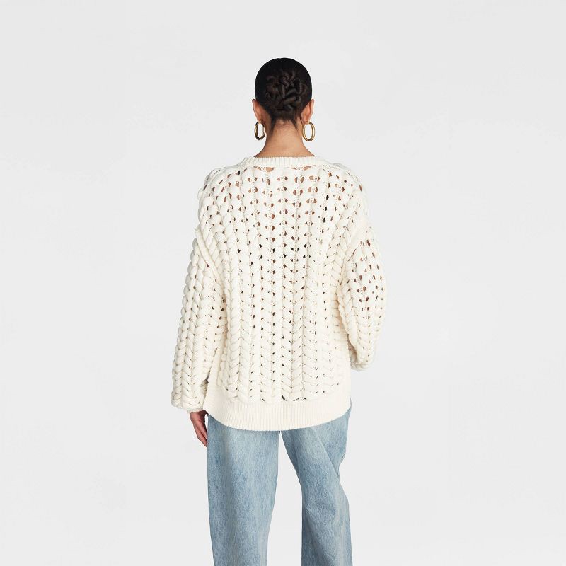 A nautical touch made ultra-modern, this fisherman sweater is knit from an open, chunky basket weave pattern and features long drop sleeves. Complete with ribbed trim and vented sides. Pair with our B…