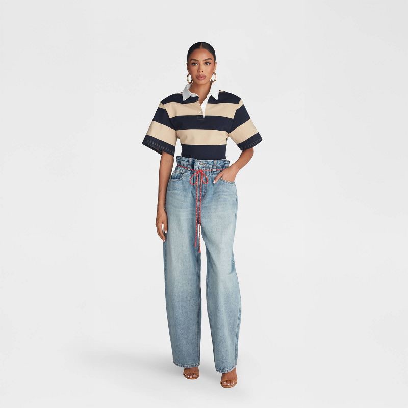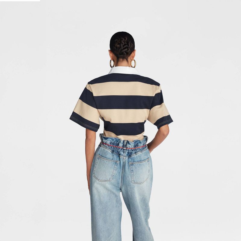 Not your average rugby tee, this piece is designed with a cinched waist for a snatched look, balanced with padded shoulders for the perfect hourglass effect. Complete with a rugby stripe pattern and c…