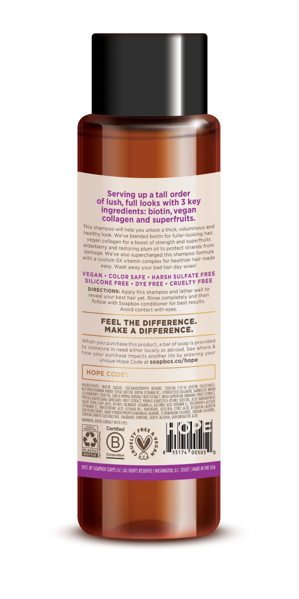 Restore and volumize your hair with Soapbox Biotin & Superfruit Blend Strengthening Shampoo for healthy, fuller-looking hair. This volumizing shampoo strengthens hair with vegan collagen, elderberry a…
