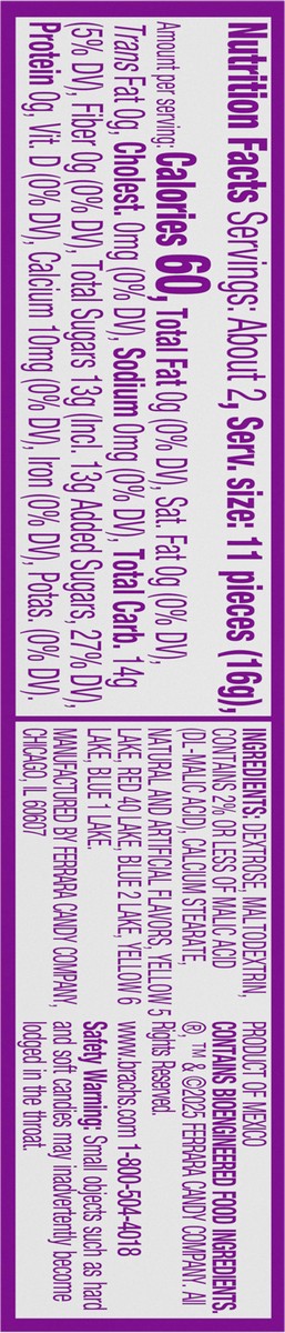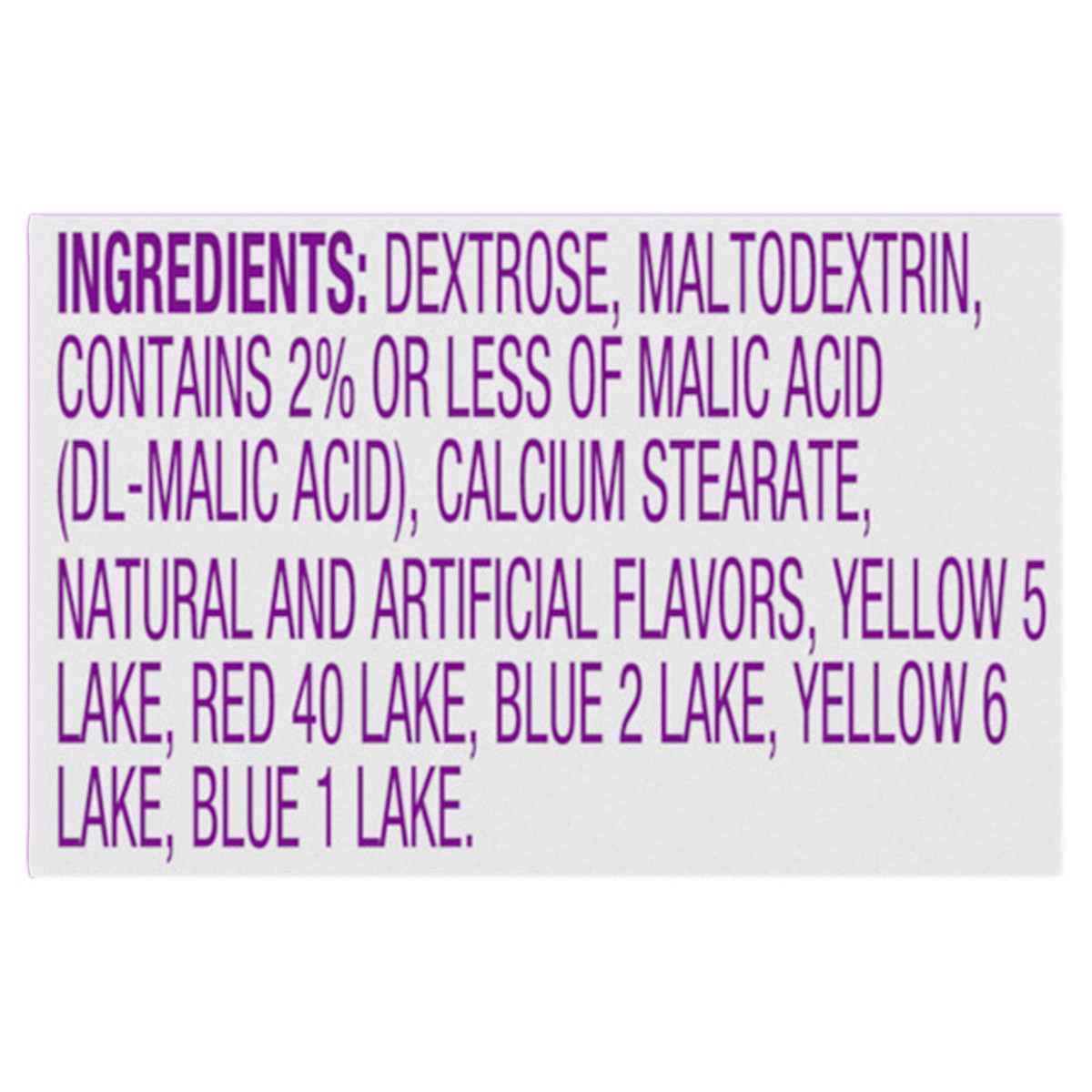 Dextrose, Maltodextrin, Contains 2% or Less of Malic Acid (DL-Malic Acid), Calcium Stearate, Natural and Artificial Flavors, Yellow 5 Lake, Red 40 Lake, Blue 2 Lake, Yellow 6 Lake, Blue 1 Lake.