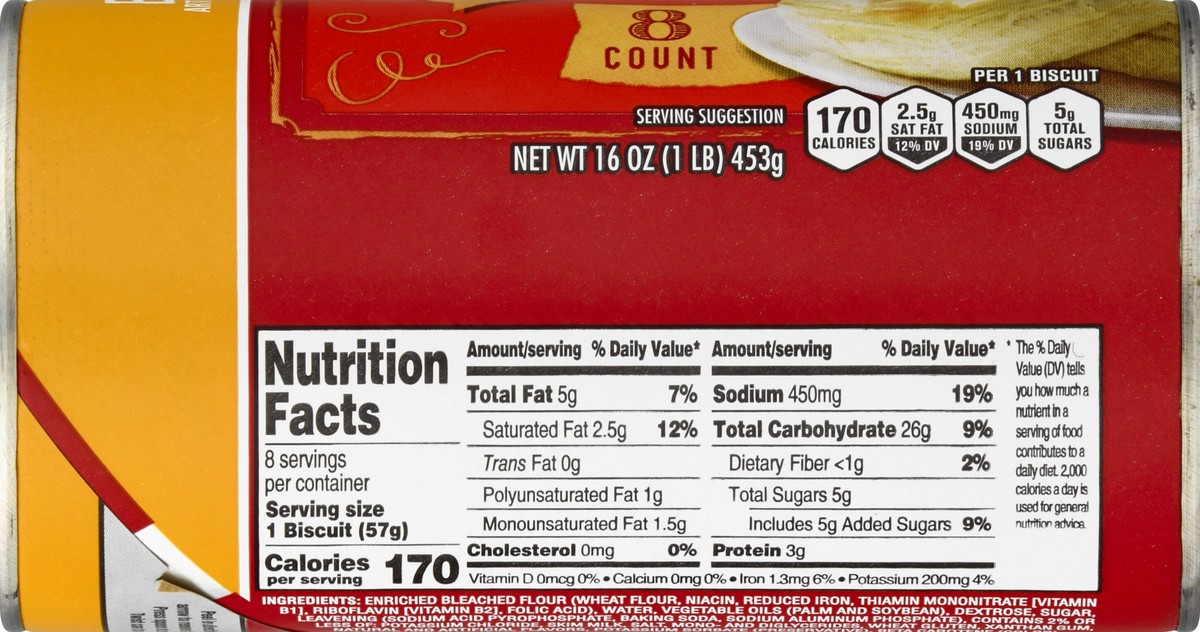 Artificially flavored. Per 1 Biscuit: 170 calories; 2.5 g sat fat (2% DV); 460 mg sodium (18% DV); 5g total sugars. Contents a bioengineered food ingredients. No high fructose corn syrup. No certified…