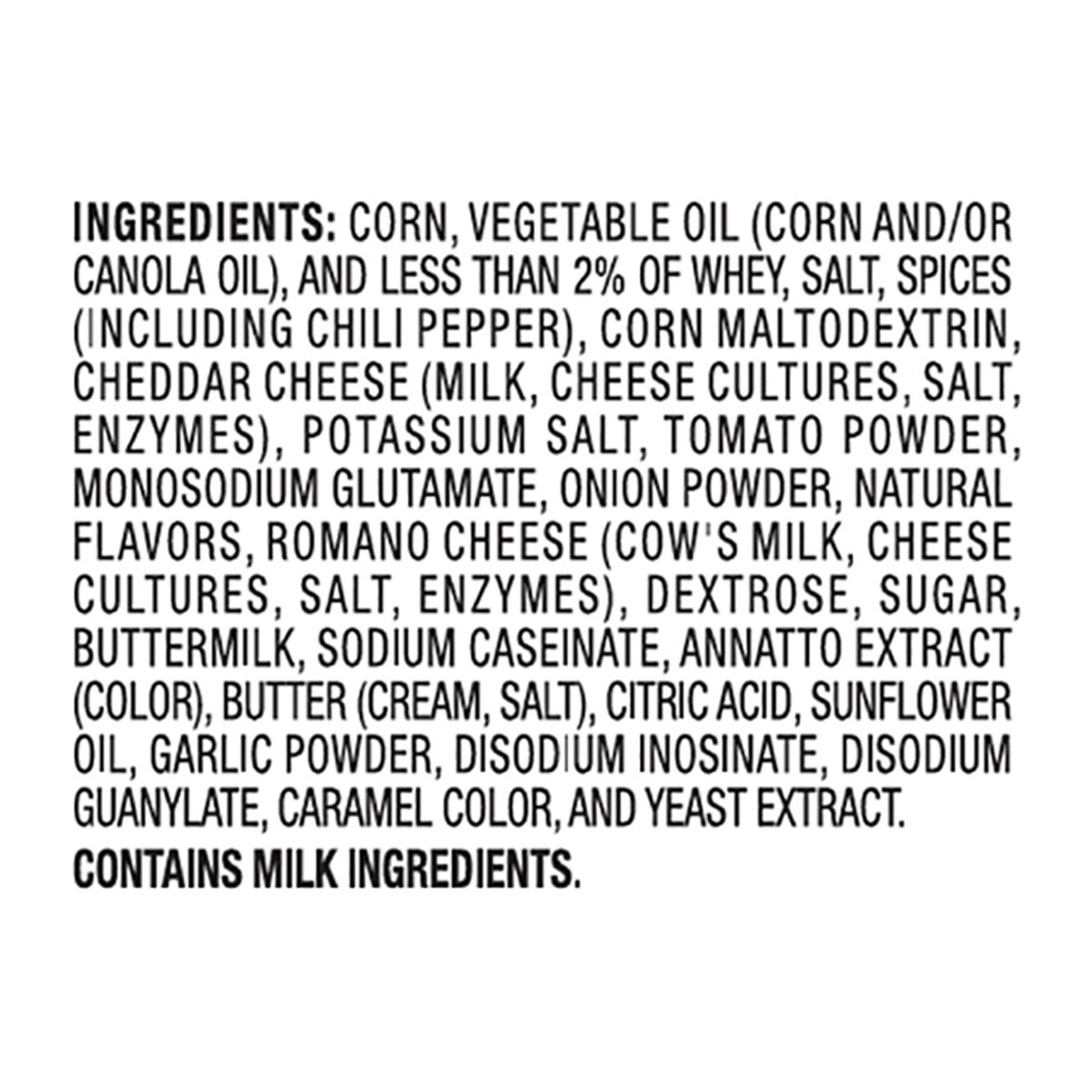 Corn, Vegetable Oil (Corn and/or Canola Oil), and Less than 2% of Whey, Salt, Spices (Including Chili Pepper), Corn Maltodextrin, Cheddar Cheese (Milk, Cheese Cultures, Salt, Enzymes), Potassium Salt,…
