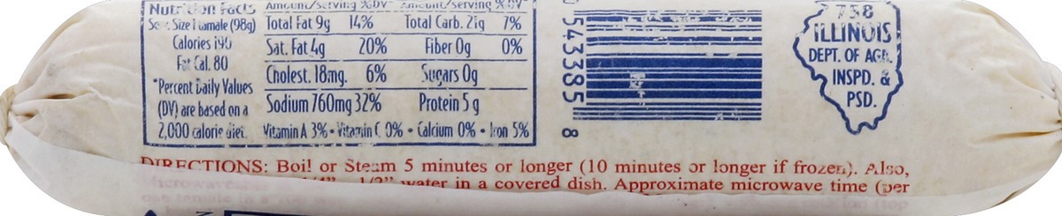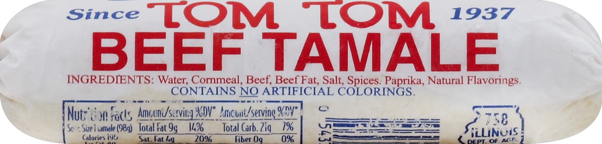 Net wt 3-1/2 oz (98 g) minimum. Delicious beef tamales. Contains no artificial colorings. Since 1937. Oh! Give me a bite. 758 Illinois Dept. of Agr. Inspd. & Psd.