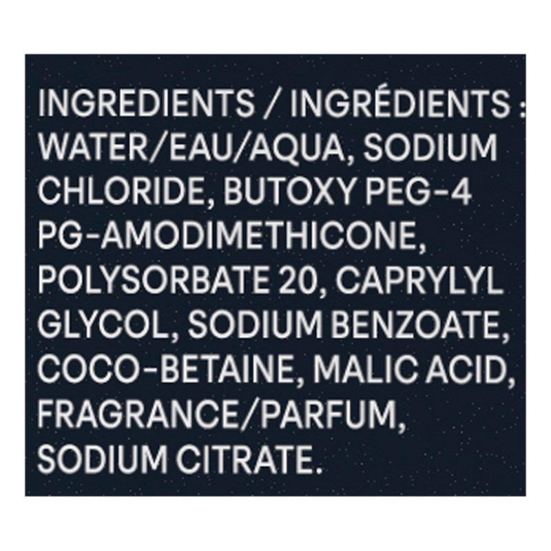 Water/Eau/Aqua, Sodium Chloride, Butoxy PEG-4 PG-Amodimethicone, Polysorbate 20, Caprylyl Glycol, Sodium Benzoate, Cocoa-Betaine, Malic Acid, Fragrance/Parfum, Sodium Citrate.