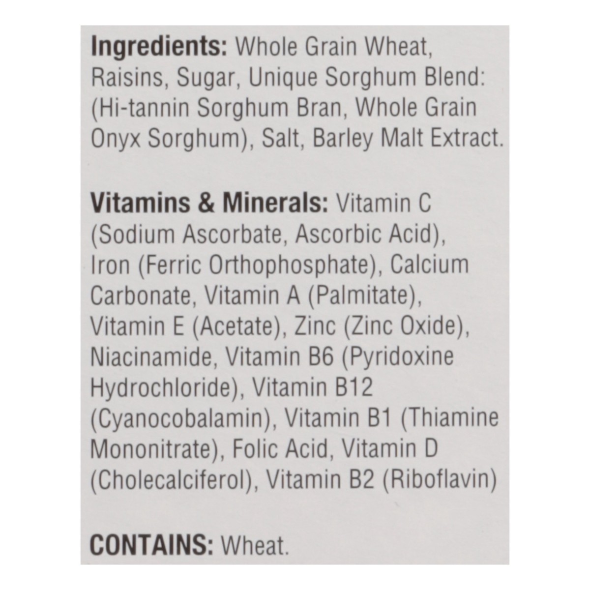 Whole Grain Wheat, Raisins, Sugar, Unique Sorghum Blend: (Hi-Tannin Sorghum Bran, Whole Grain Onyx Sorghum), Salt, Barley Malt Extract, Vitamins & Minerals: Vitamin C (Sodium Ascorbate, Ascorbic Acid)…