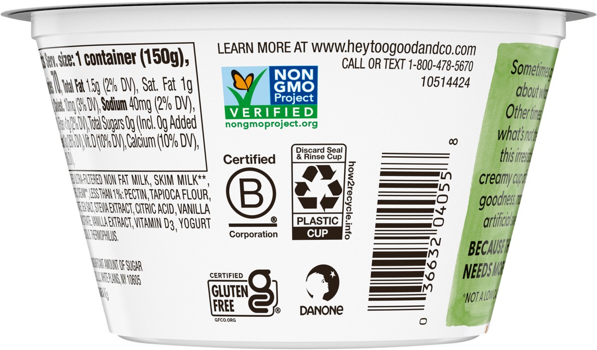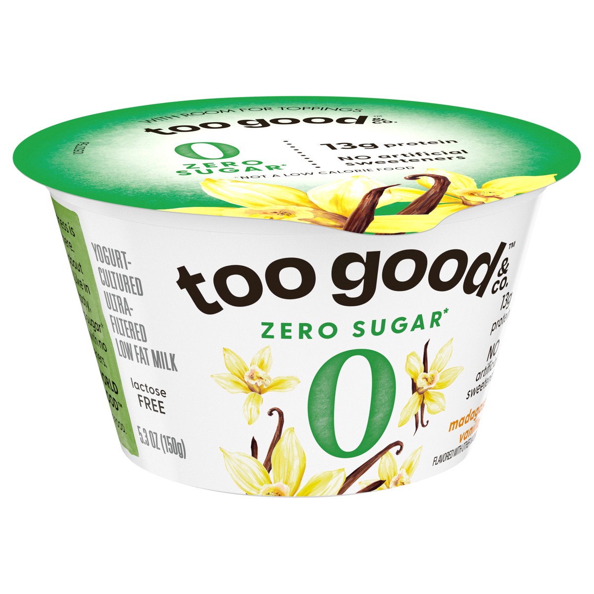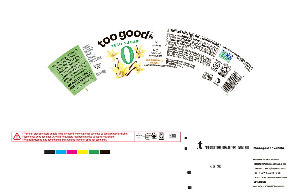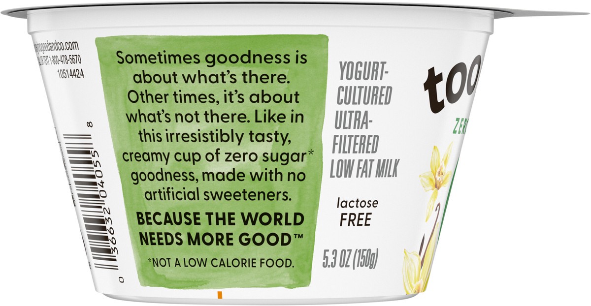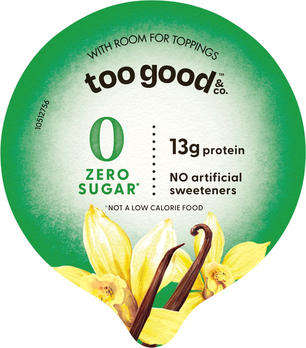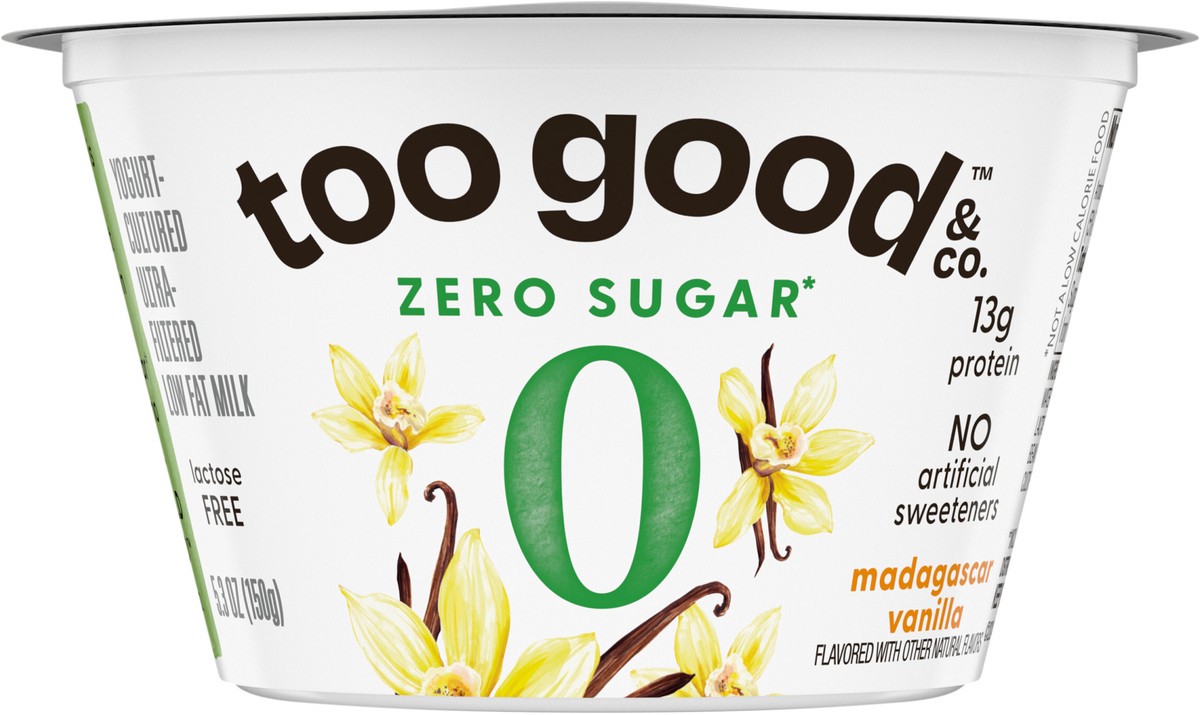 - DELICIOUSLY CREAMY: One 5.3 oz cup of Too Good & Co. Zero Sugar Vanilla Yogurt-Cultured Ultra-Filtered Low Fat Milk Product