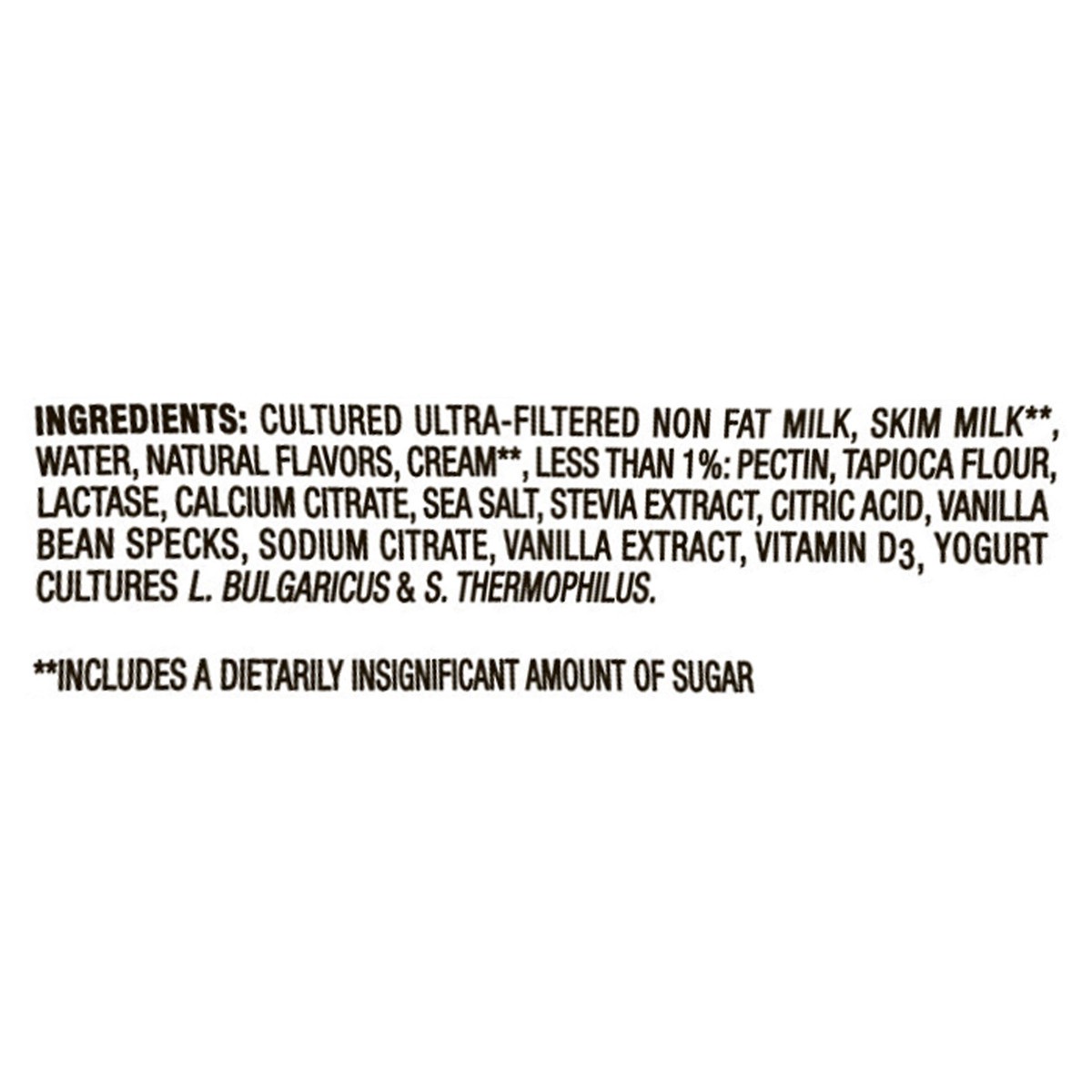 Cultured Ultra-Filtered Non Fat Milk, Skim Milk **, Water, Natural Flavors, Cream **, Less than 1%: Pectin, Tapioca Flour, Lactase, Calcium Citrate, Sea Salt, Stevia Extract, Citric Acid, Vanilla Bean…