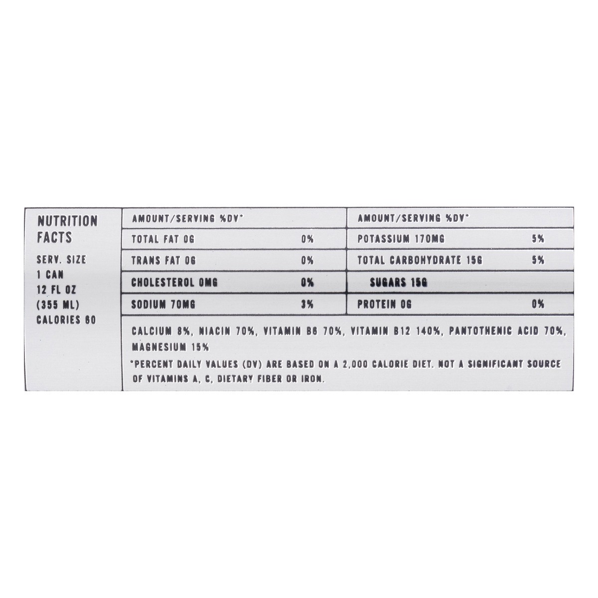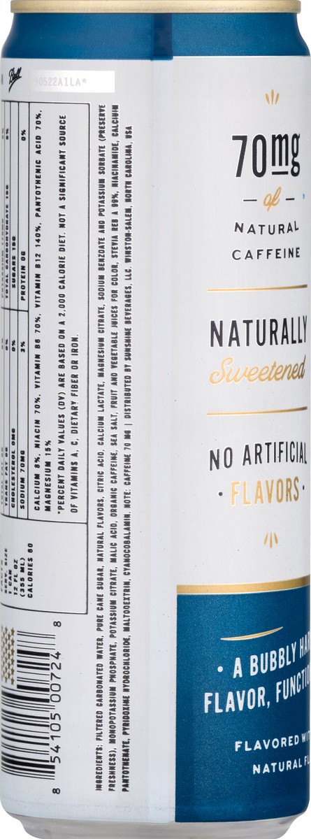 No artificial flavors. Flavored with other natural flavors. 60 Calories per can. Vitamin B12 & electrolytes. Good energy. With vitamins B3, B5 and B6. A bubbly harmony of flavor, function & feeling. N…