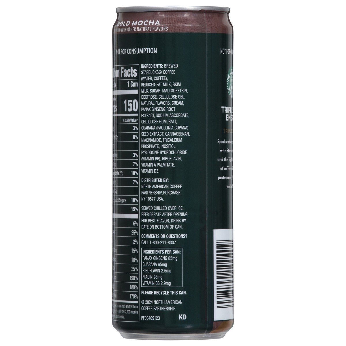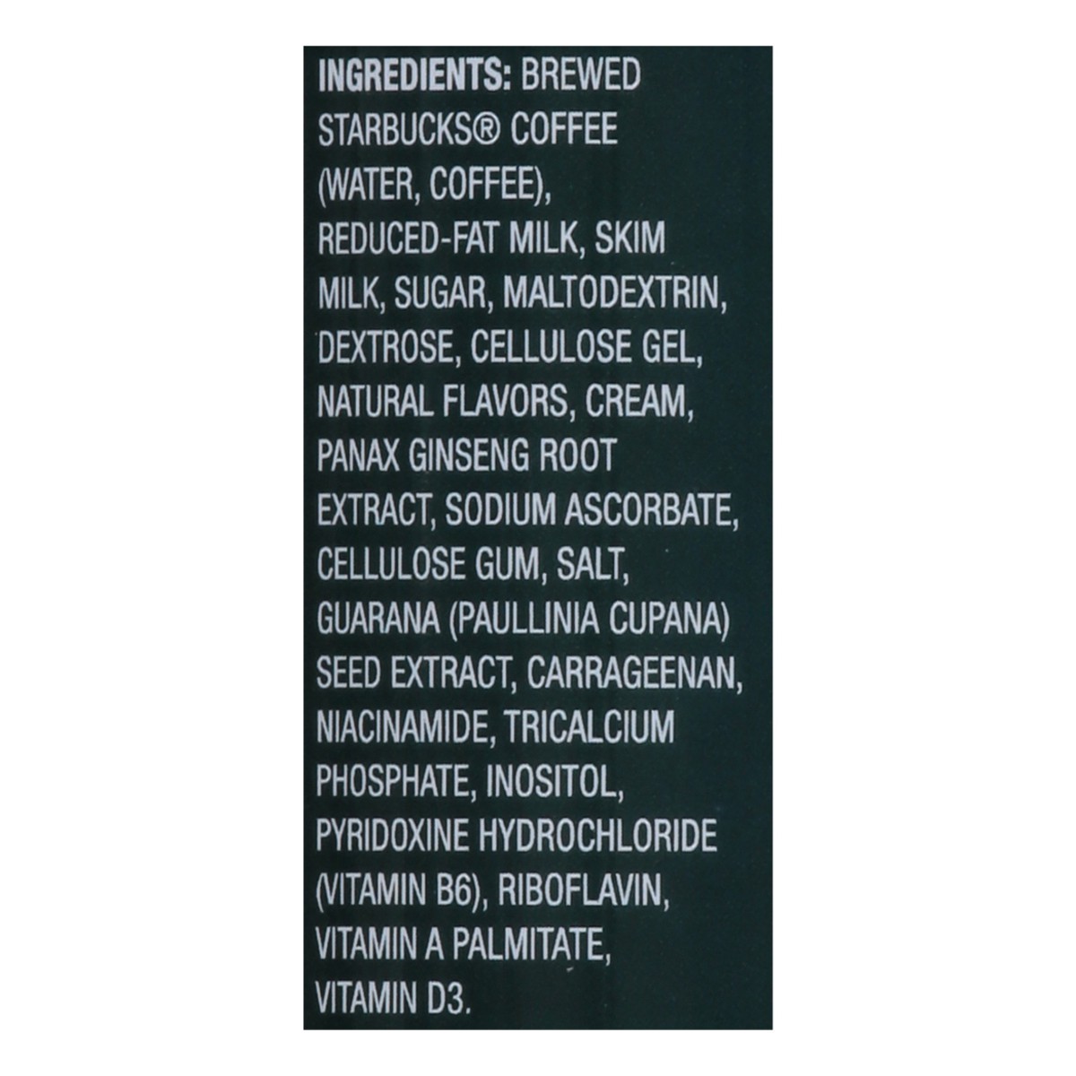 Brewed Starbucks Coffee (Water, Coffee), Reduced-Fat Milk, Skim Milk, Sugar, Maltodextrin, Dextrose, Cellulose Gel, Natural Flavors, Cream, Panax Ginseng Root Extract, Sodium Ascorbate, Cellulose Gum,…